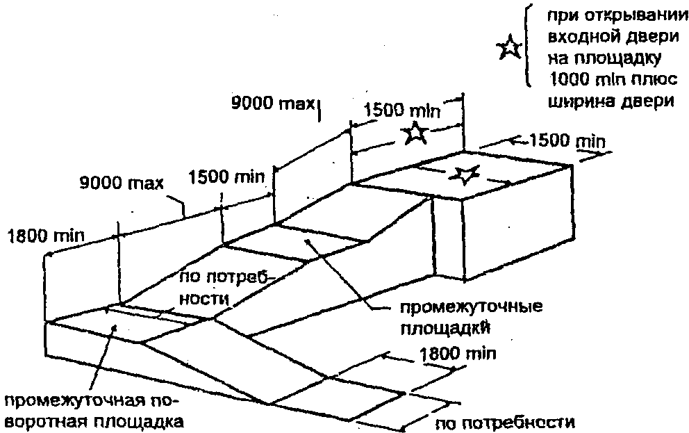 Не более чем через каждые 9 м пандуса и при каждом повороте предусматриваются горизонтальные площадки размером не менее 1500 x 1500 мм.