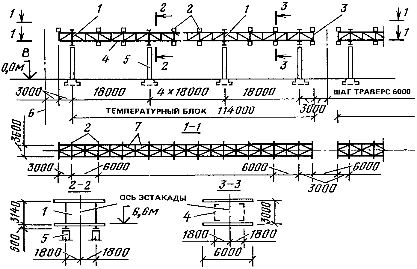Эстакада состоит из опор (опора включает в себя: колонны, связи, ригели, фундаменты), пролетных строений (ферм, балок), траверс, связей по фермам