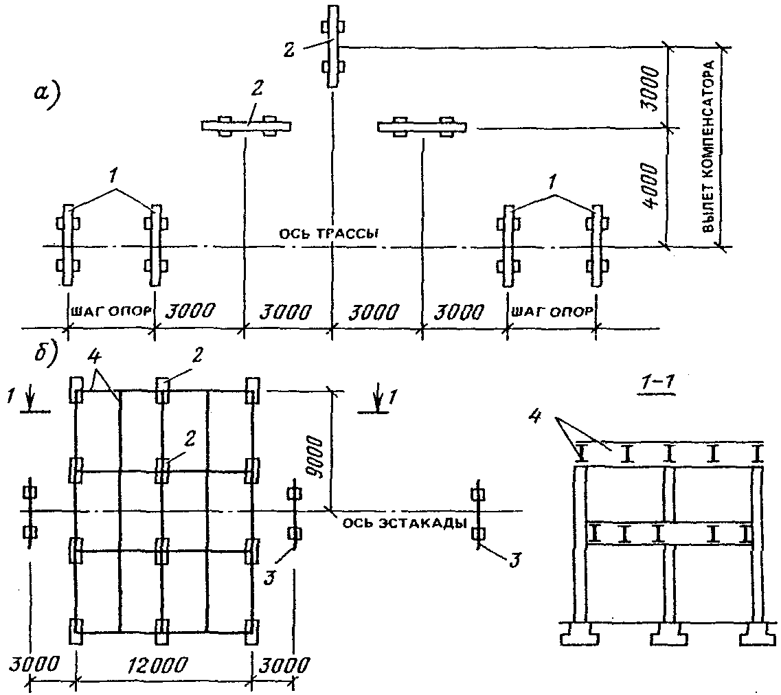 Примечания. 1. При прокладке трубопроводов по отдельно стоящим опорам образуется условный температурный блок, включающий в себя анкерную и промежуточные опоры.