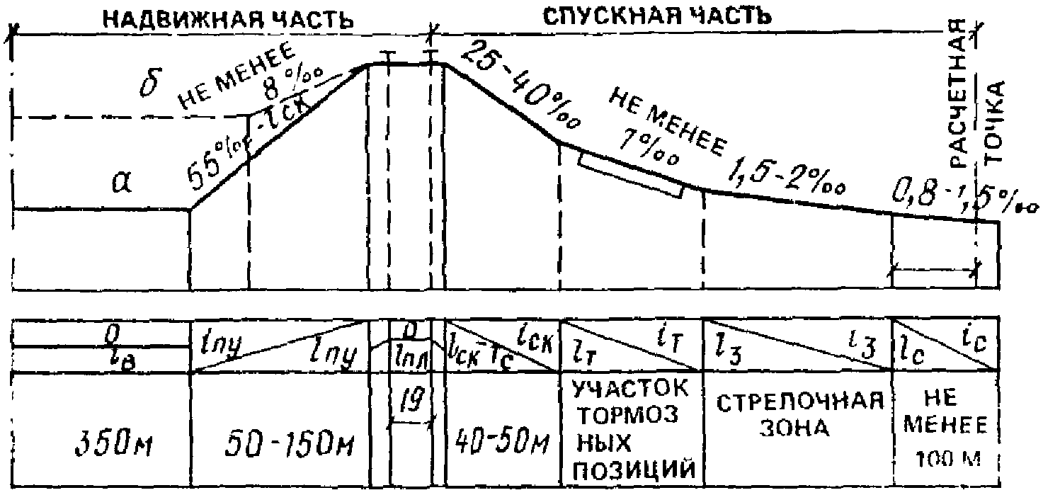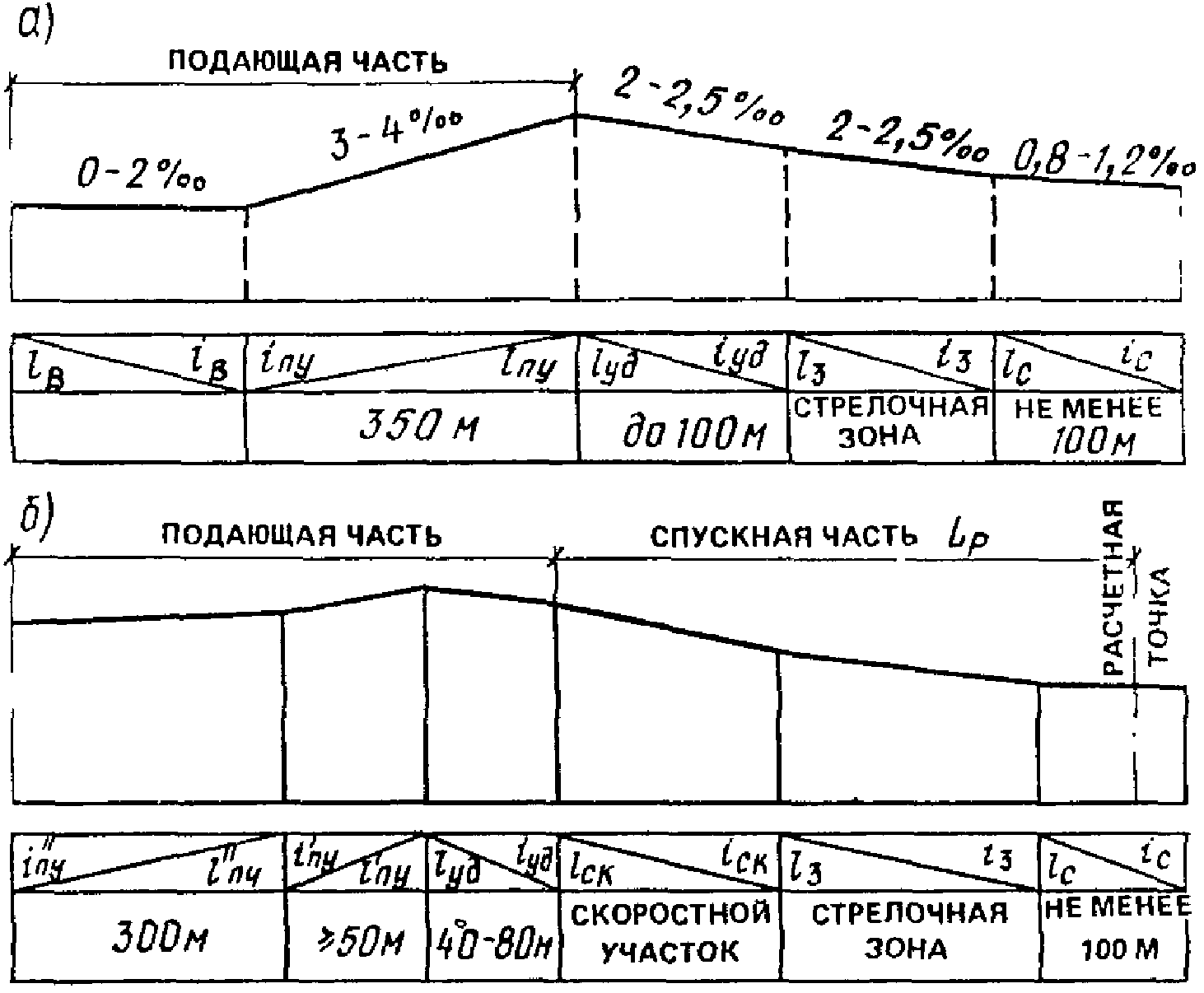 Если систематическое отправление поездов непосредственно с сортировочных путей не предусматривается, то в голове сортировочного парка должны укладываться симметричные стрелочные переводы марки 1/6, предназначенные для горочных путей (см.