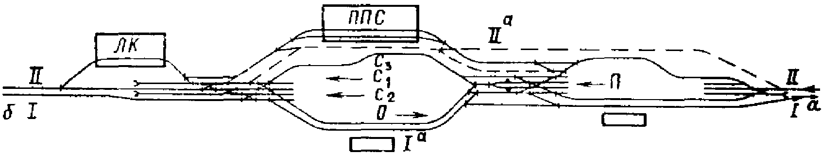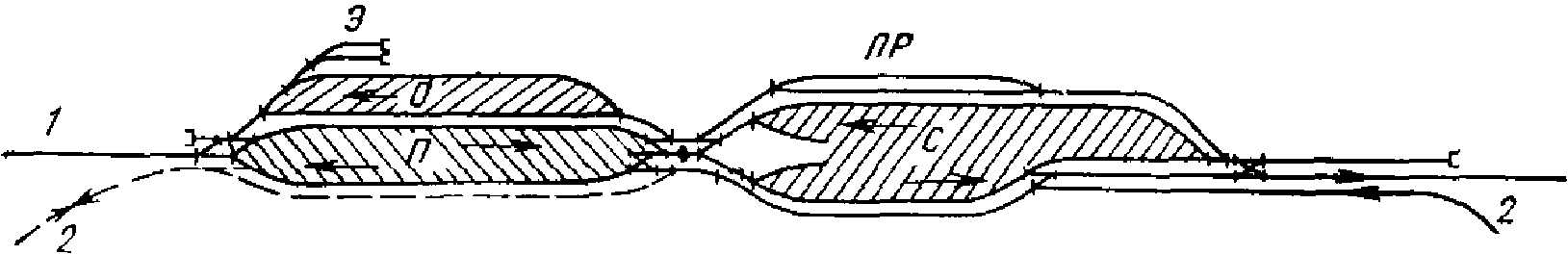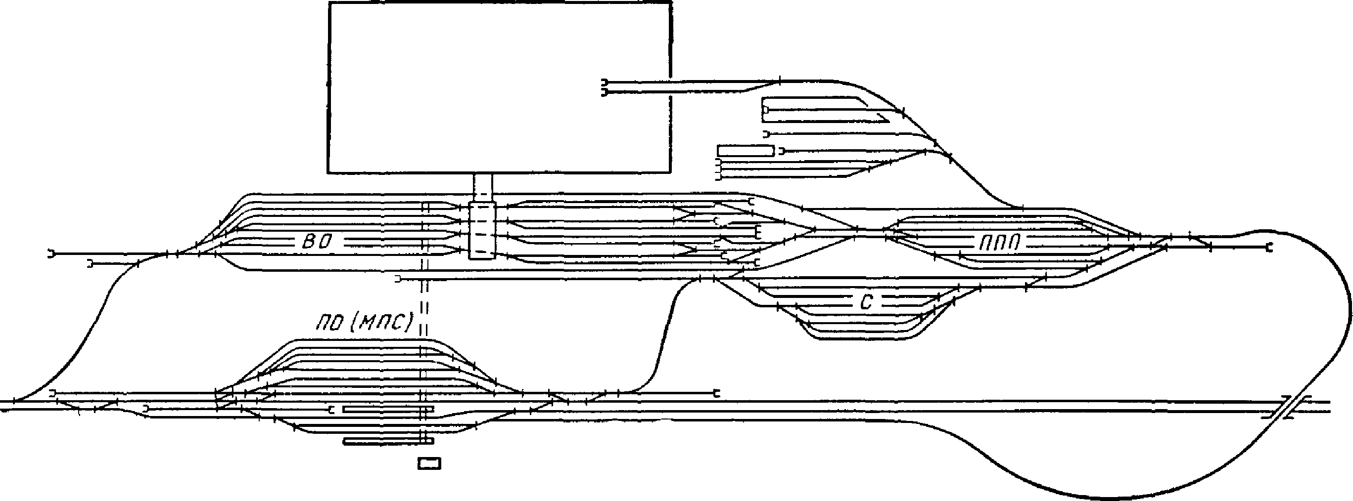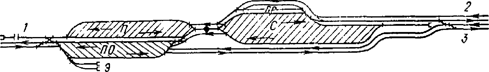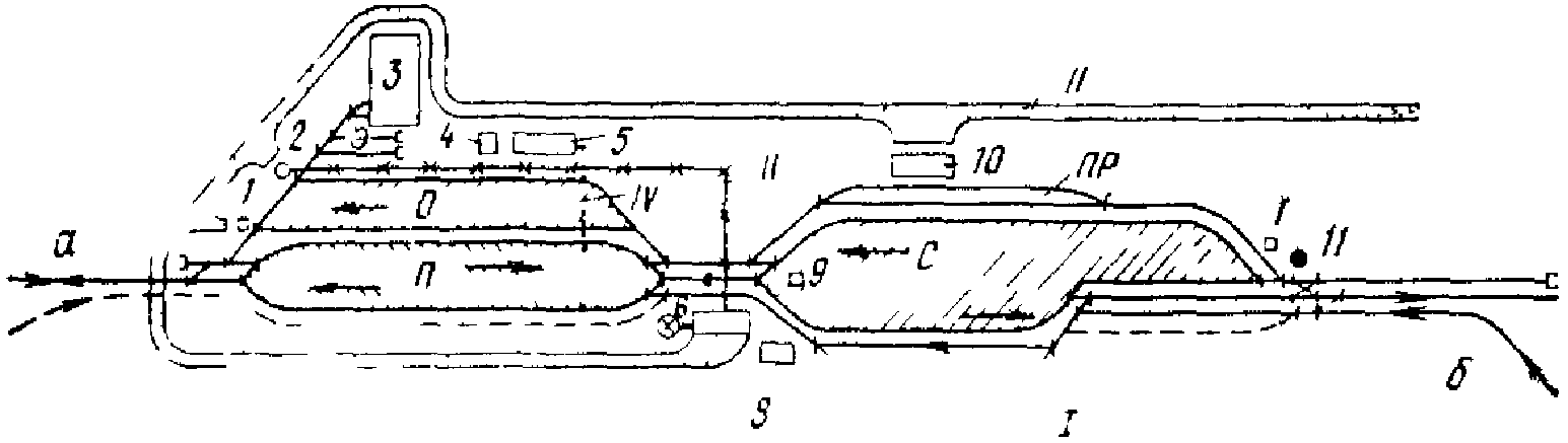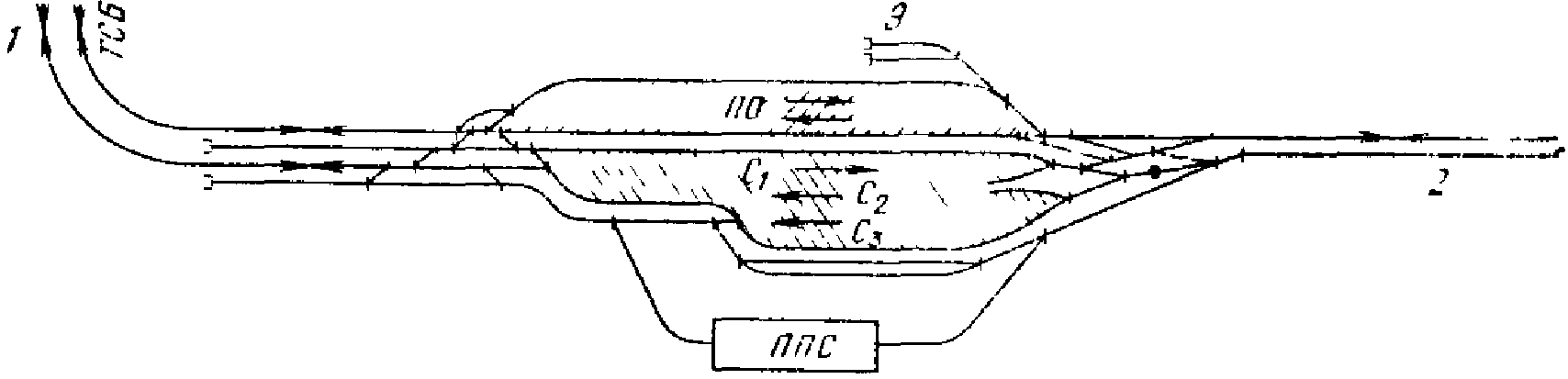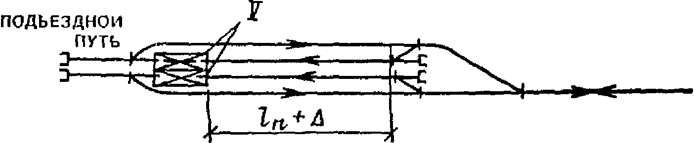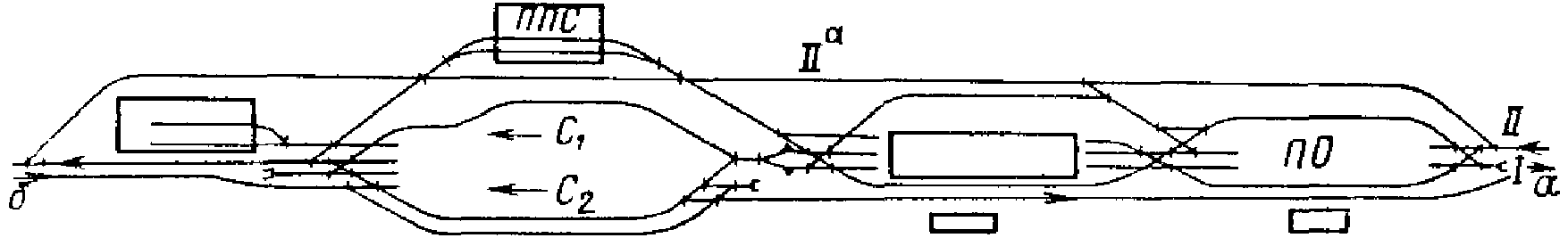 <*> Главные пути в приемо-отправочных парках станций промышленных предприятий выделяются только в случае пропуска через эти станции транзитных или пассажирских поездов, а также в случае отправления поездов своего формирования из сортировочного парка (при последовательном расположении парков).