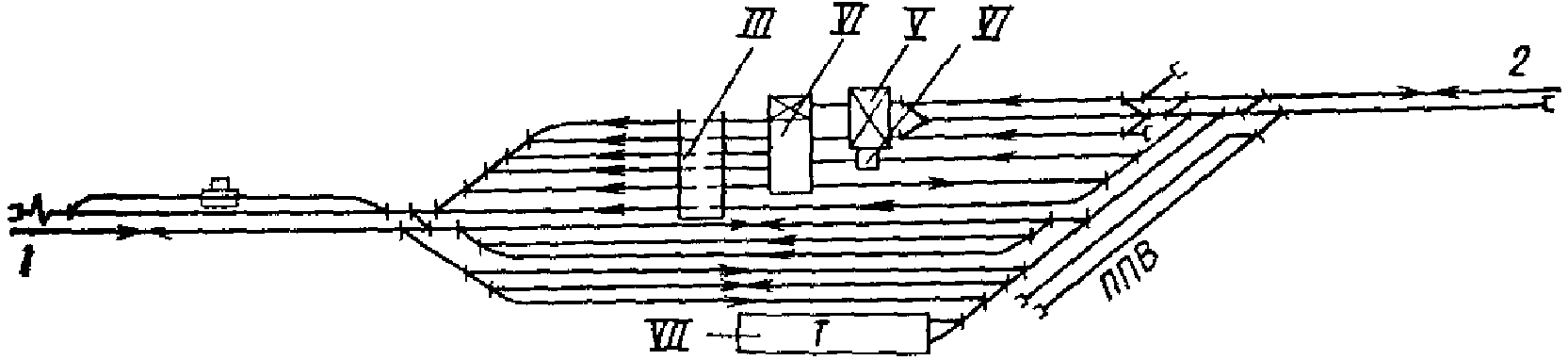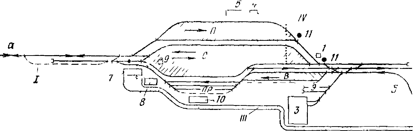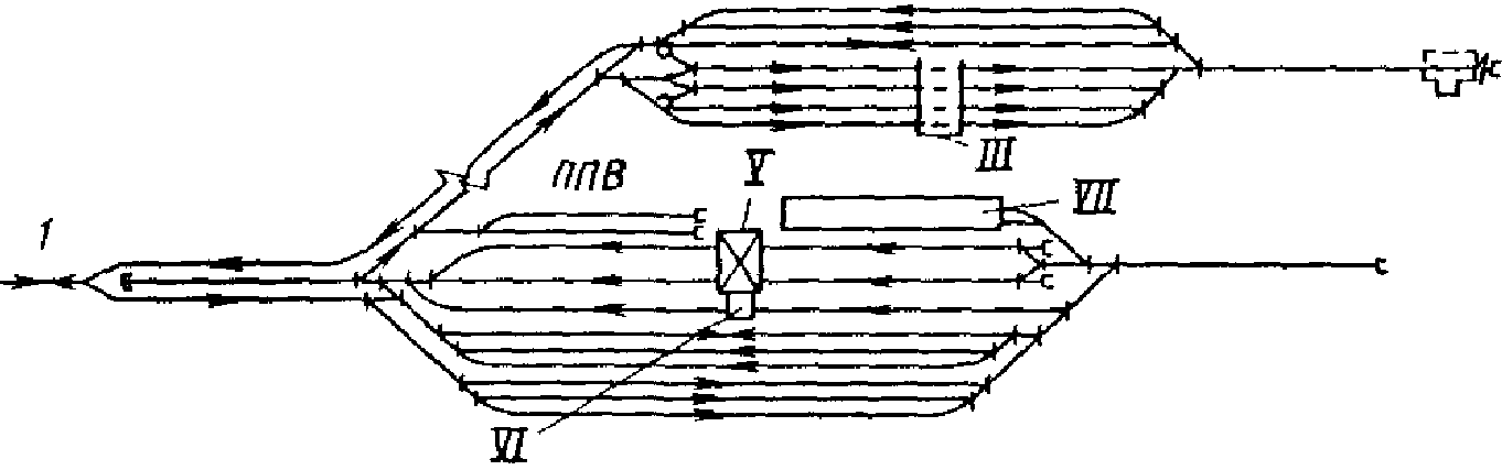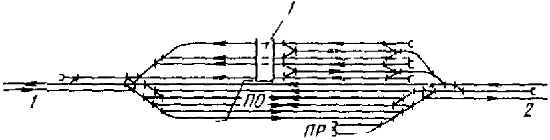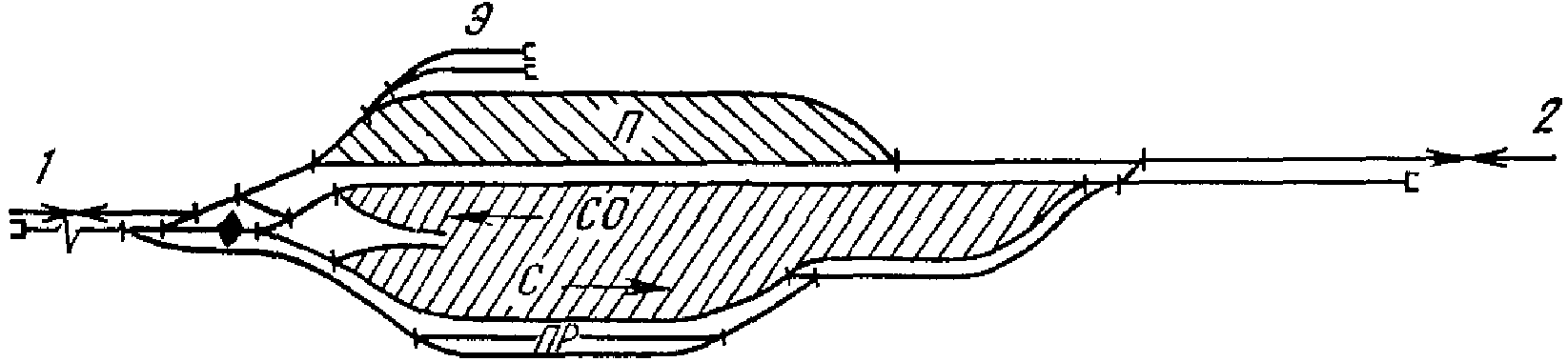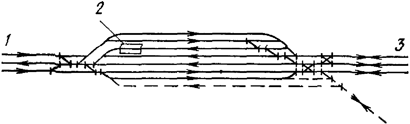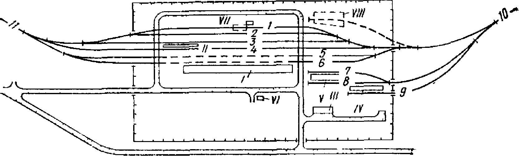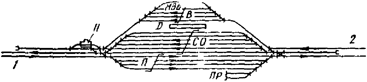 <*> Главные пути в приемо-отправочных парках станций промышленных предприятий выделяются только в случае пропуска через эти станции транзитных или пассажирских поездов, а также в случае отправления поездов своего формирования из сортировочного парка (при последовательном расположении парков).