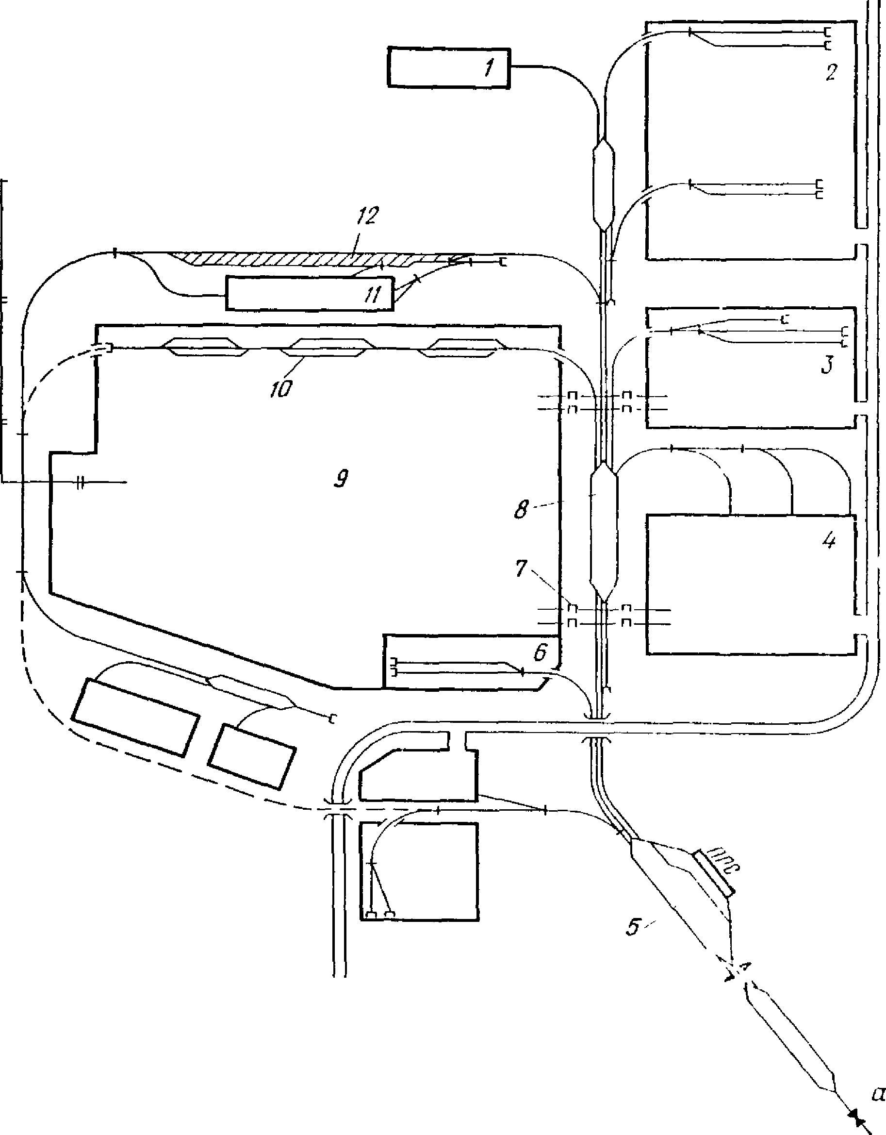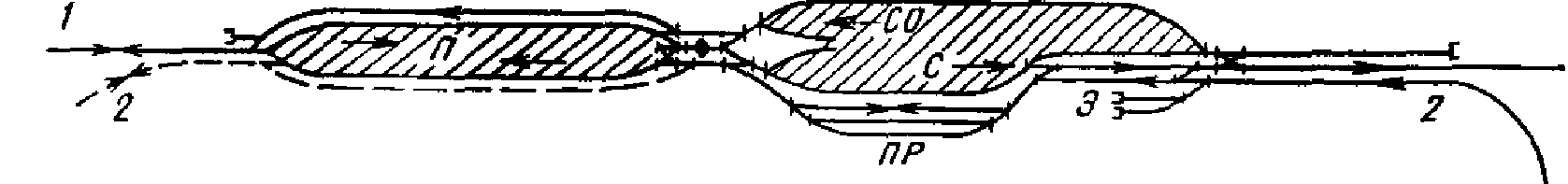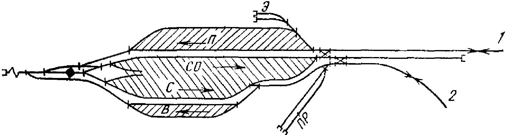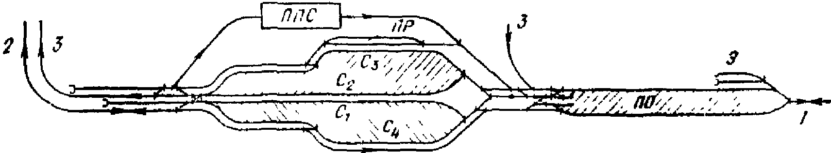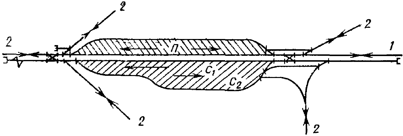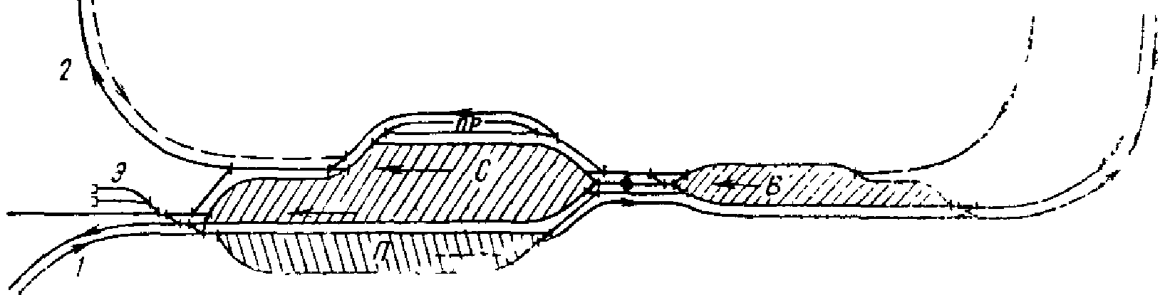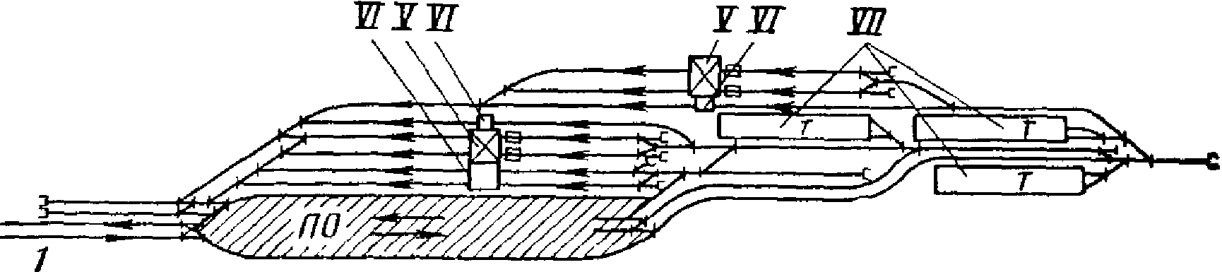 <*> Главные пути в приемо-отправочных парках станций промышленных предприятий выделяются только в случае пропуска через эти станции транзитных или пассажирских поездов, а также в случае отправления поездов своего формирования из сортировочного парка (при последовательном расположении парков).