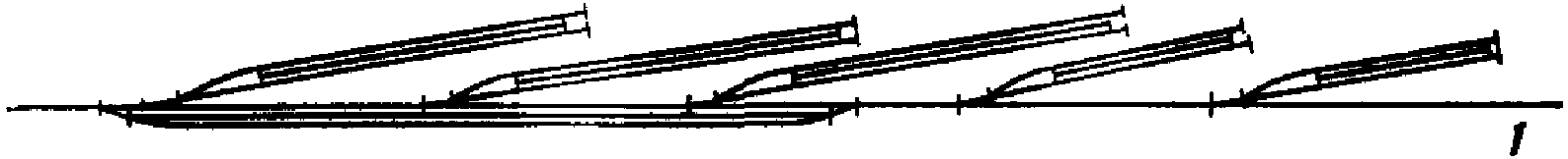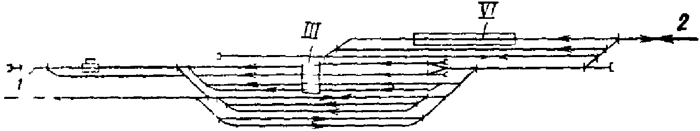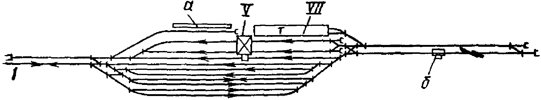 схеме 1 табл. 16 со вставкой между стыками рамных рельсов d не менее 6,25 м, а в стесненных условиях - не менее 4,5 м. При этом в голове сортировочных пусков, с путей которых намечается регулярное отправление поездов, должны быть уложены стрелочные переводы марки 1/6, предназначенные для приемо-отправочных путей.