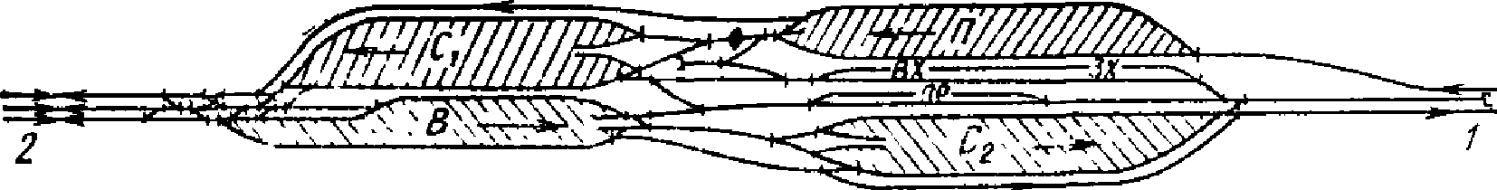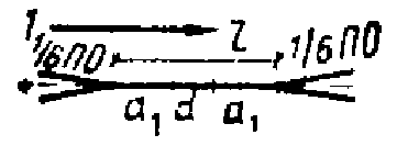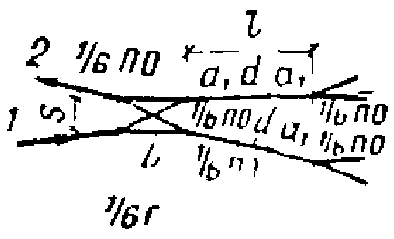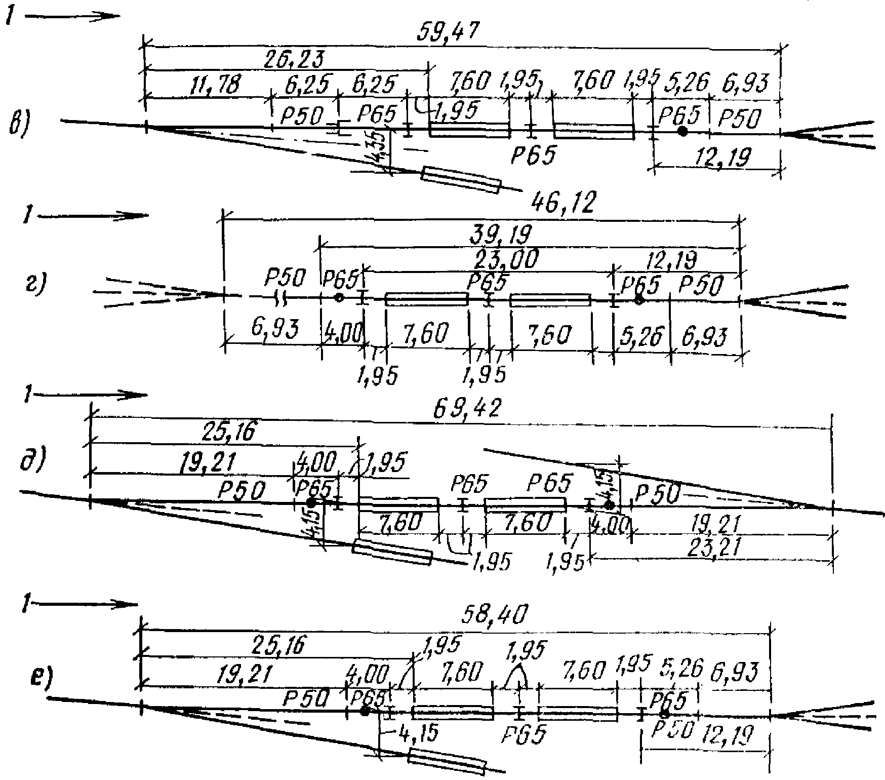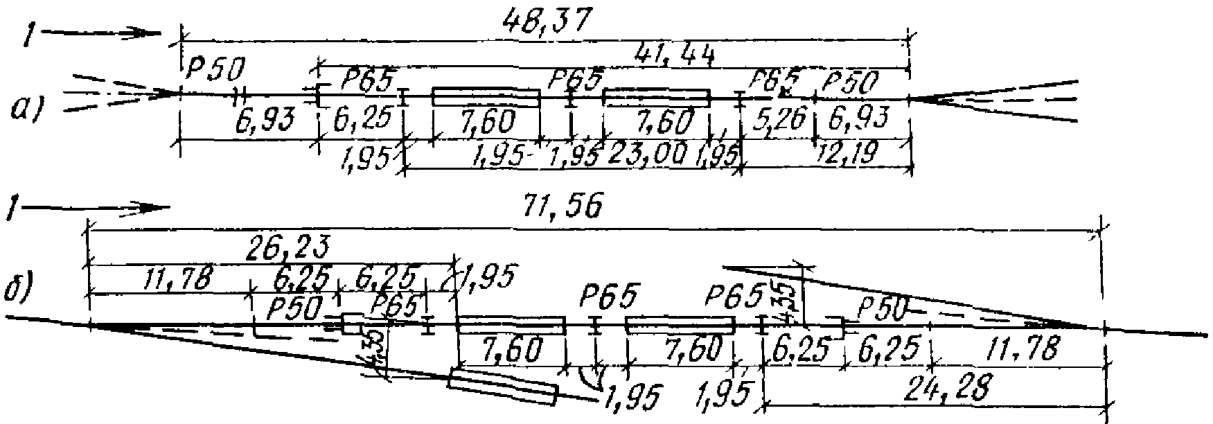 Укладка двух встречных симметричных стрелочных переводов во всех остальных случаях производится с прямой вставкой d, равной в нормальных условиях 6,25 м, а в стесненных условиях - 5,26 м исходя из условия, чтобы расстояние от оси стыка рамного рельса одного стрелочного перевода до начала остряка второго перевода было не менее 6 м. В голове сортировочного парка в этом случае рекомендуется укладывать стрелочные переводы марки 1/6, предназначенные для горочных путей (см.