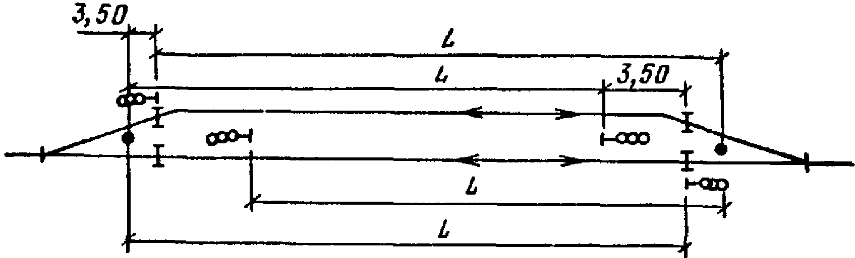 схеме 4 табл. 16 на сортировочно-отправочных путях, с которых намечается регулярное отправление поездов с транзитным пропуском их через станцию примыкания общей сети, прямая вставка должна быть не менее 7,46 м с тем, чтобы обеспечить необходимую длину между концом переводной кривой первого стрелочного перевода и началом остряка второго стрелочного перевода, равную 12 м.