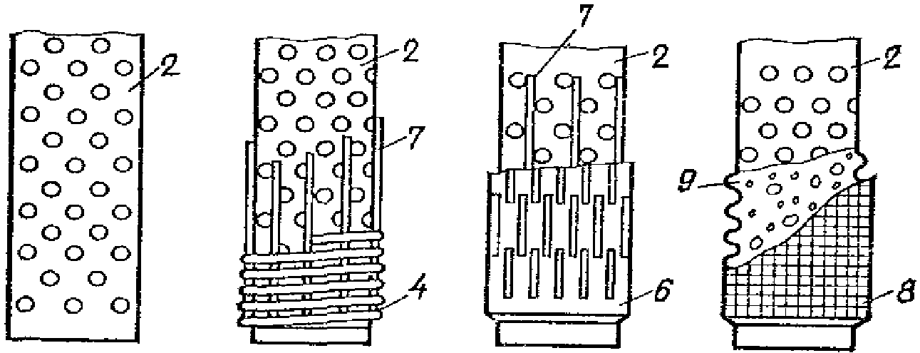 19.9. Для восстановления производительности скважин реагентными методами необходимо следующее оборудование: передвижная емкость или баллоны в кислотостойком исполнении для доставки кислоты к скважине; заливочная емкость для приготовления раствора; насос в кислотостойком исполнении для закачки раствора в фильтр скважины; оголовок для герметизации устья скважины; пакер для герметизации фильтра; шланги для подачи реагента и отвода продуктов реакции; манометр; эрлифтная система; компрессор производительностью 3 - 6 м3/мин. В основном все оборудование для обработки скважин является стандартным; определенную специфику представляет оголовок для герметизации устья скважины. Основные типы оголовков представлены на рис. 110, а пневматический пакер для герметизации фильтра - на