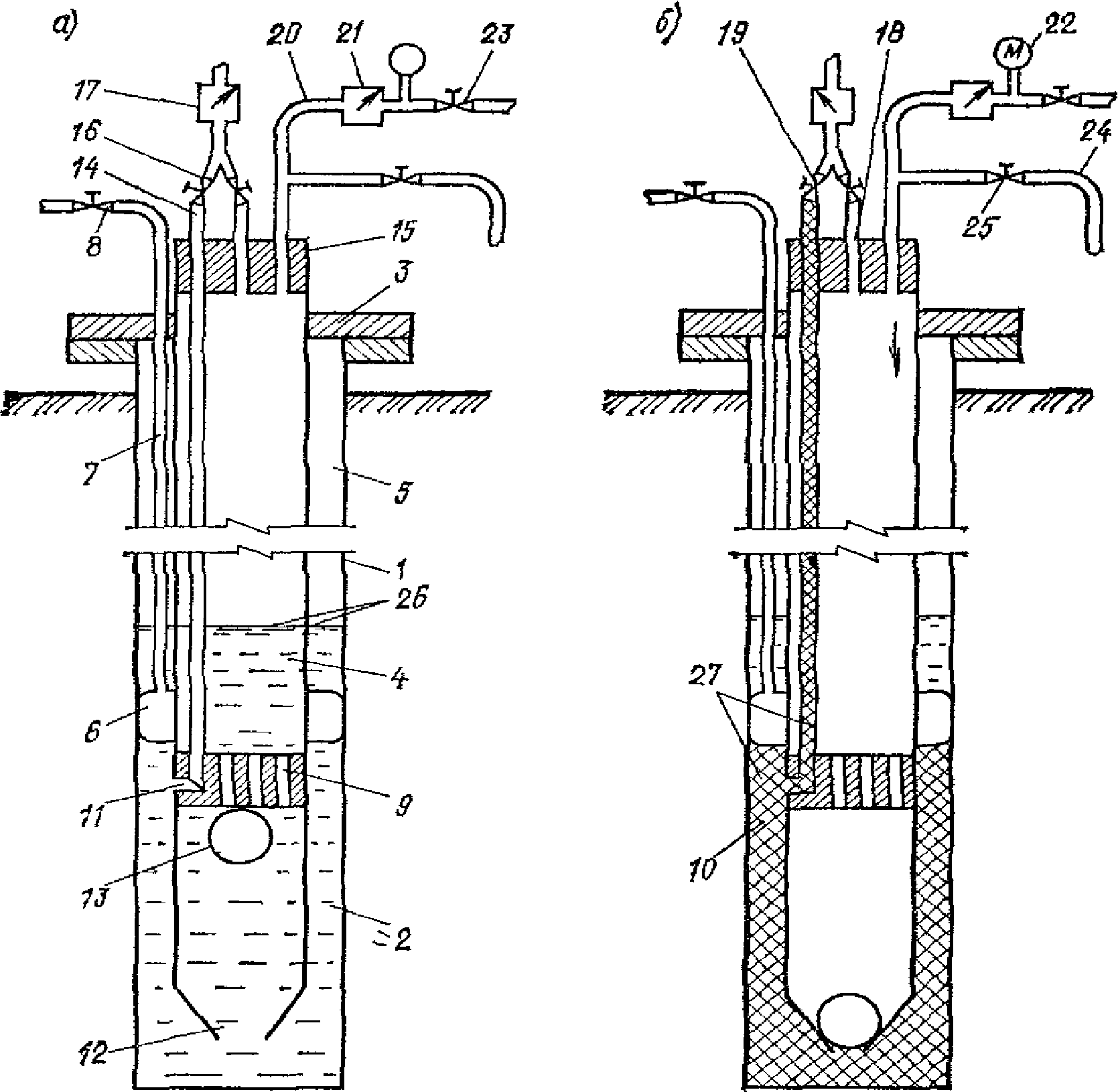 19.11. Наиболее эффективная регенерация герметизированных скважин, каптирующих песчаные породы, обеспечивается созданием пульсирующего возвратно-поступательного движения реагента в прифильтровой зоне, осуществляемого путем повышения и снятия давления или путем вакуумирования скважины с последующей ее разгерметизацией. Количество задавливаемого реагента должно быть достаточным для заполнения пор гравийной обсыпки или закольматированной прифильтровой зоны, поэтому время задавливания и снятия давления определяется положением уровня жидкости в стволе скважины, что может контролироваться с помощью уровнемера. Ориентировочно в каждом цикле повышения - снятия давления должно обеспечиваться давление 0,15 - 0,2 МПа/см2 в течение 5 мин для гравийных фильтров и 10 мин для фильтров сетчатого и блочного типа с последующим сбросом давления в течение 3 и 5 мин соответственно. При обработке скважины с применением специального устройства (см.