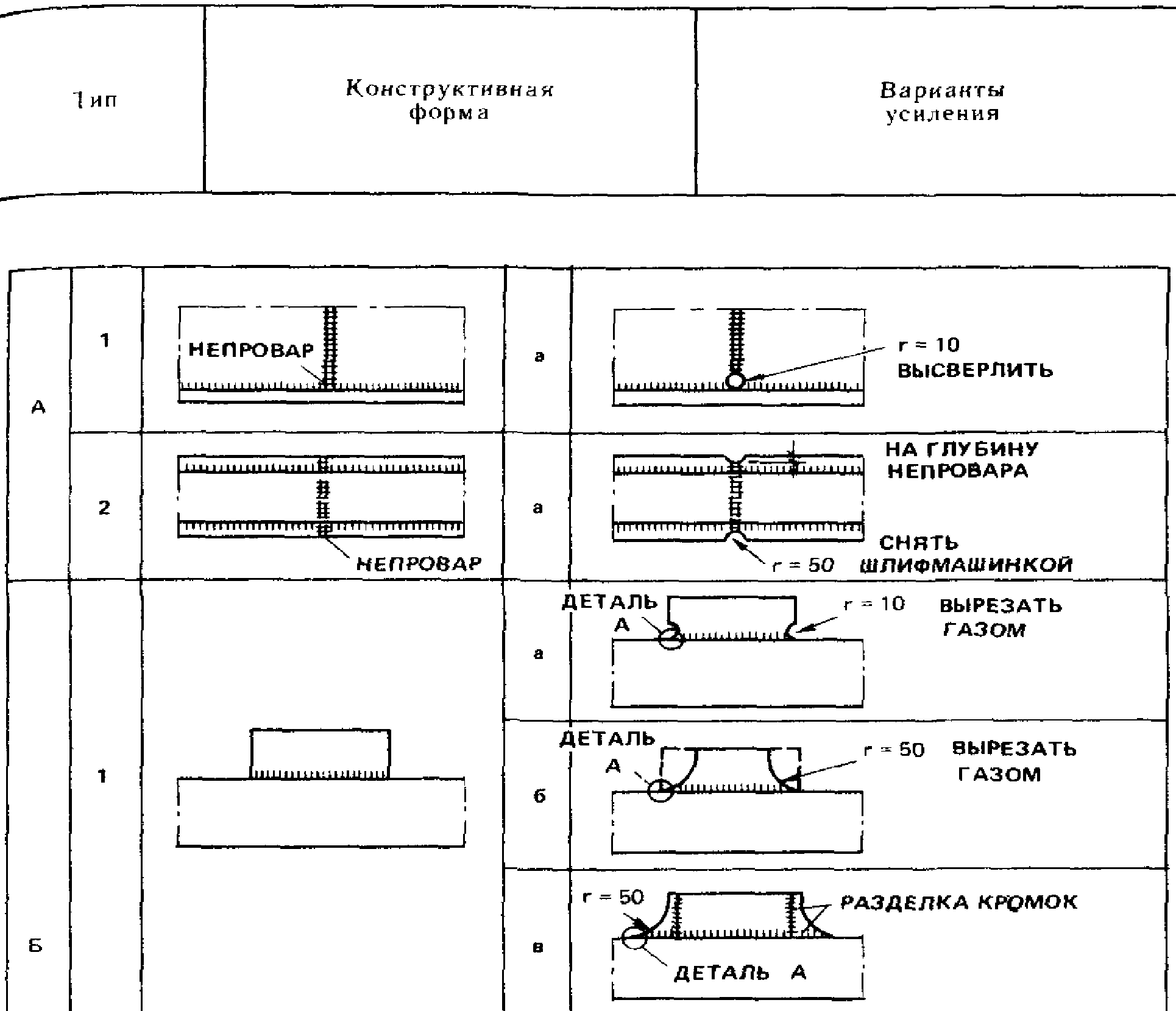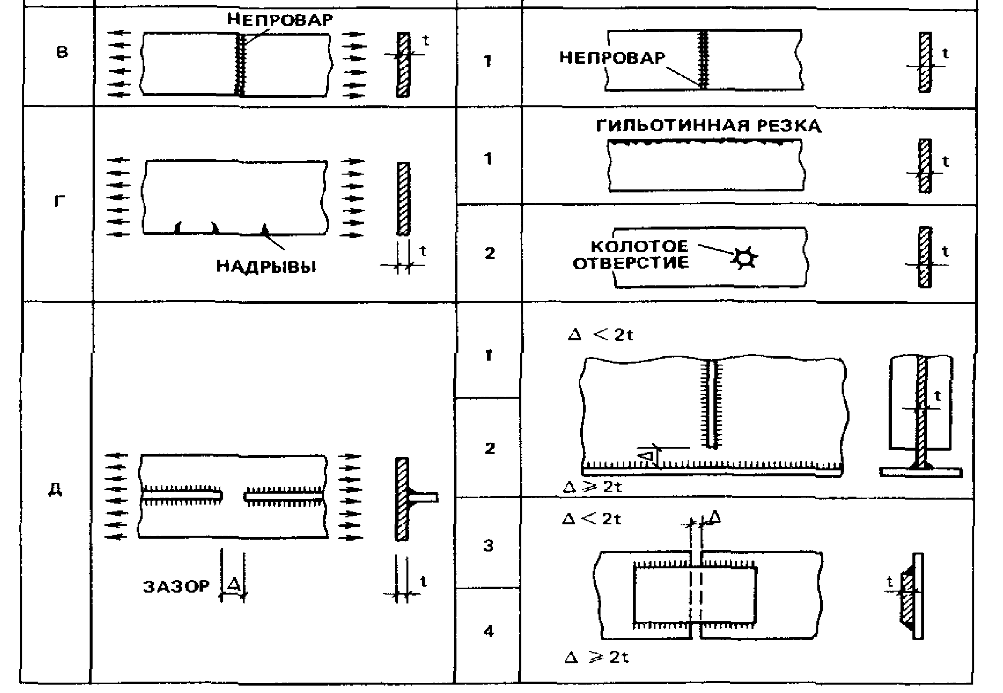 некачественное выполнение сварных швов (неполномерность швов, подрезы, непровары, прожоги, трещины, шлаковые включения, поры и др.) и болтовых или заклепочных соединений (ослабление, отсутствие болтов или заклепов и др.);