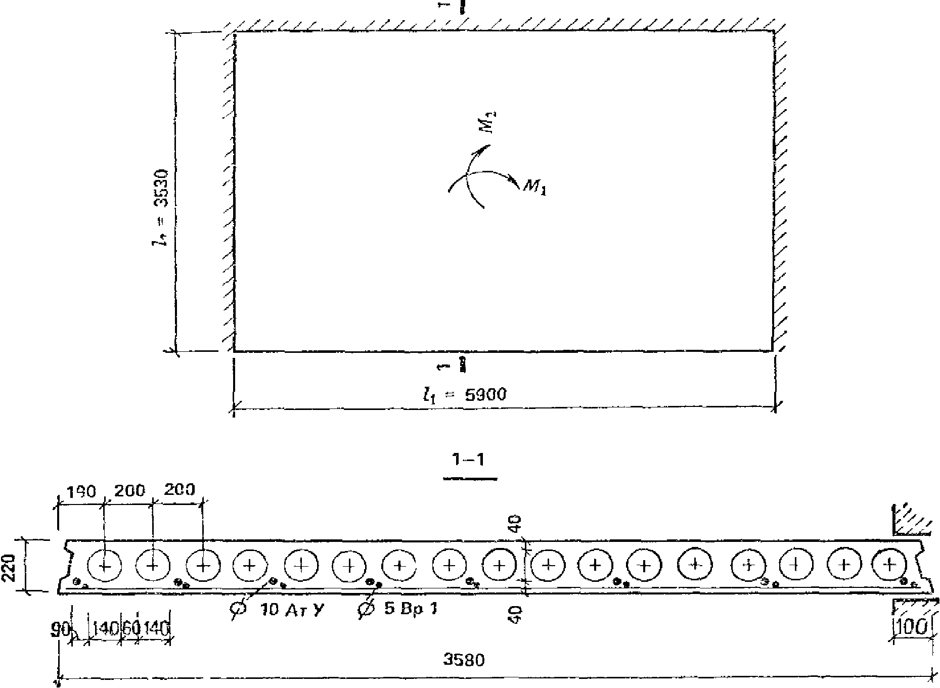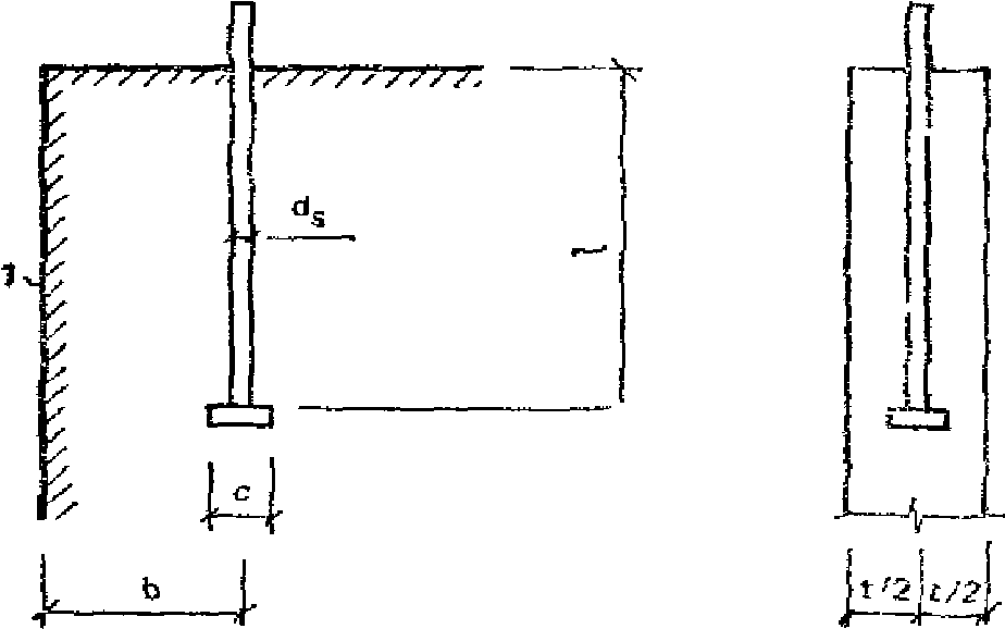Пример 1. Требуется запроектировать детали для подъема стеновой панели толщиной 14 см, массой 6000 кг. Предполагается в каждой панели установить два стержня с шайбой на конце. Расстояние от места установки деталей до края панели - 120 см. Перевод в горизонтальное положение производится с помощью кантователя, подъем - с помощью самобалансирующих траверс (усилие направлено вдоль стержня). Нормативная кубиковая прочность бетона в момент первого подъема 7,5 МПа, крупность заполнителя - 20 мм.