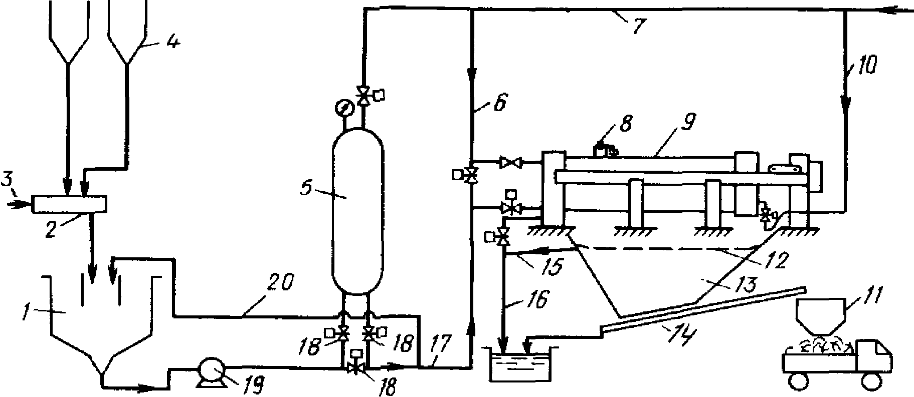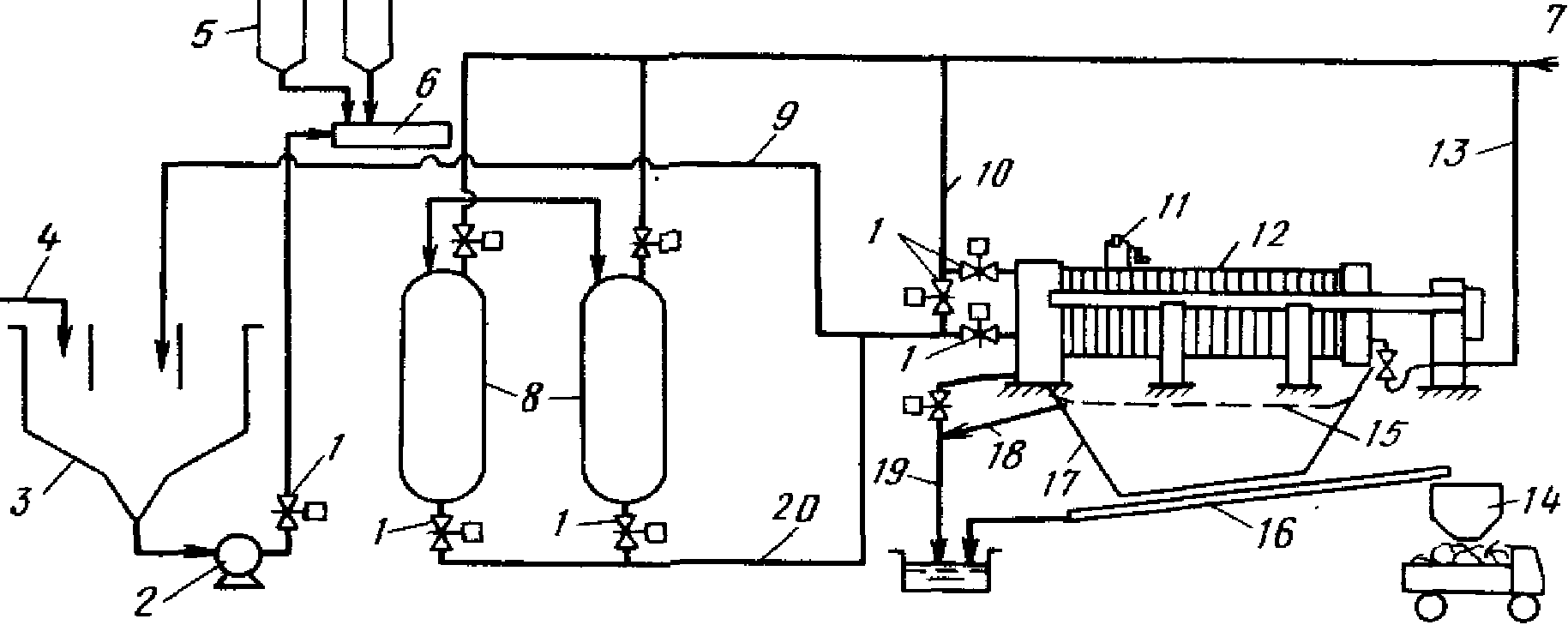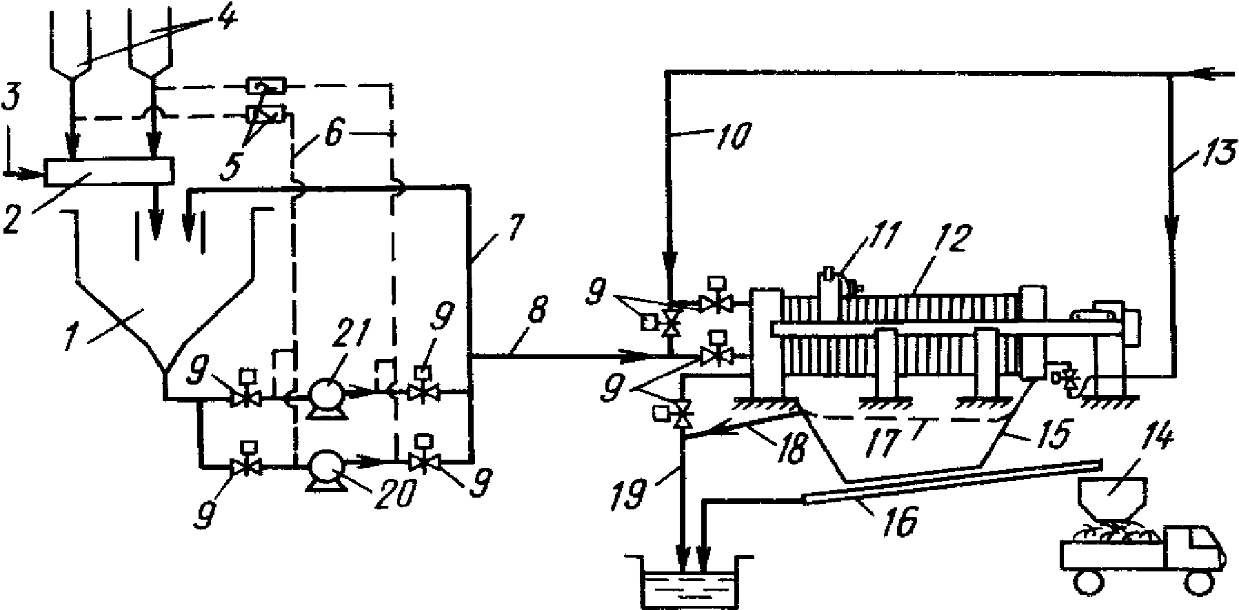 фильтр-пресса; 18 - промывная вода; 19 - фильтрат;