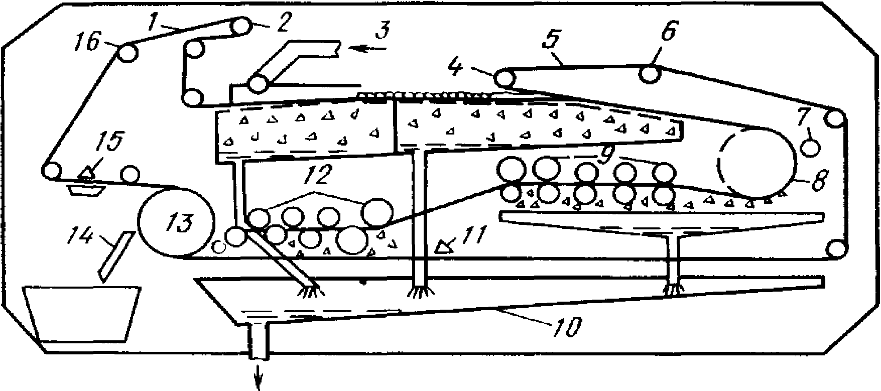 14 - бункер осадка; 15 - бункер выгрузки; 16 - транспортер;