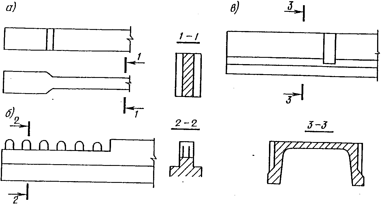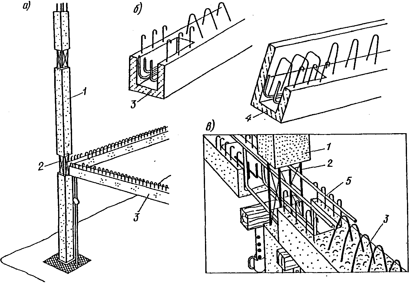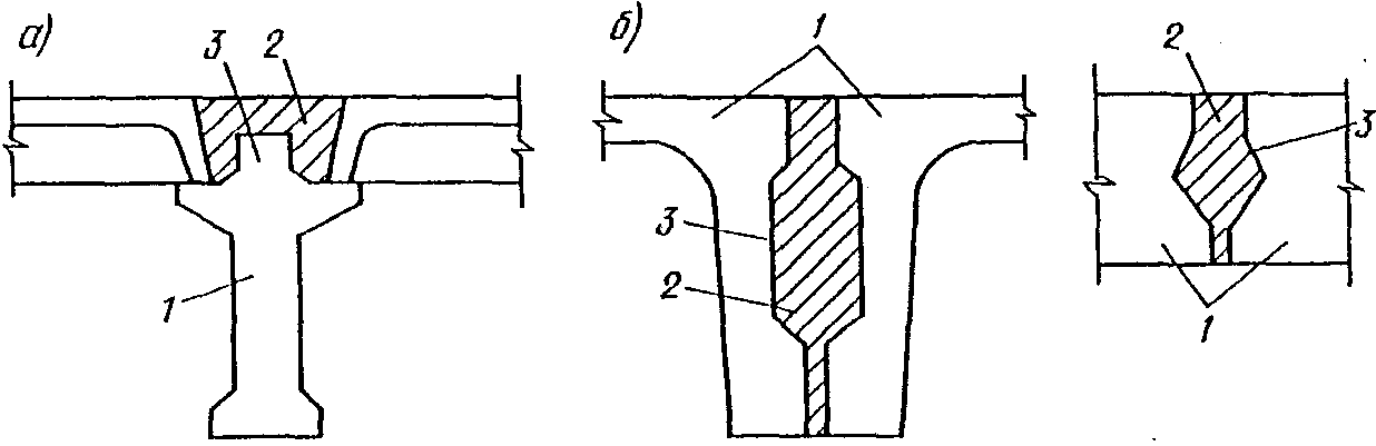 Размеры сборных элементов назначают из условий простоты их изготовления, эффективного расположения в конструкции и обеспечения требуемой прочности швов сопряжения с бетоном омоноличивания. Примеры решения некоторых сборных элементов показаны на рис. 2.