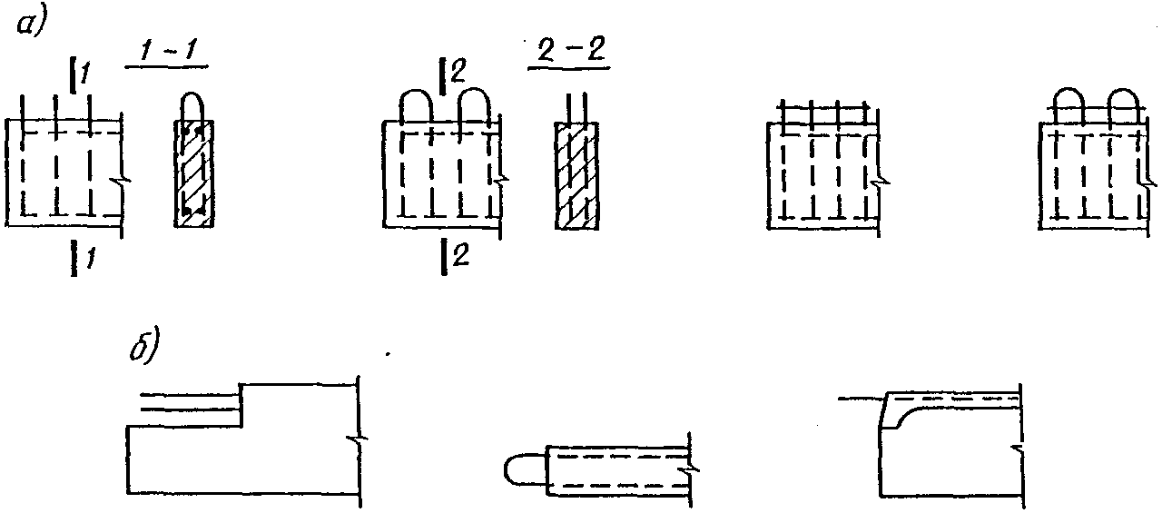 Выпуски арматуры, как правило, должны быть продолжением хомутов, поперечных стержней, сварных каркасов, продольной рабочей арматуры (рис. 31). Чтобы не усложнять изготовление сборных элементов, рекомендуется выпускать арматуру по возможности из свободных от опалубки поверхностей. Выпускаемые стержни должны иметь надежную анкеровку в бетоне омоноличивания.