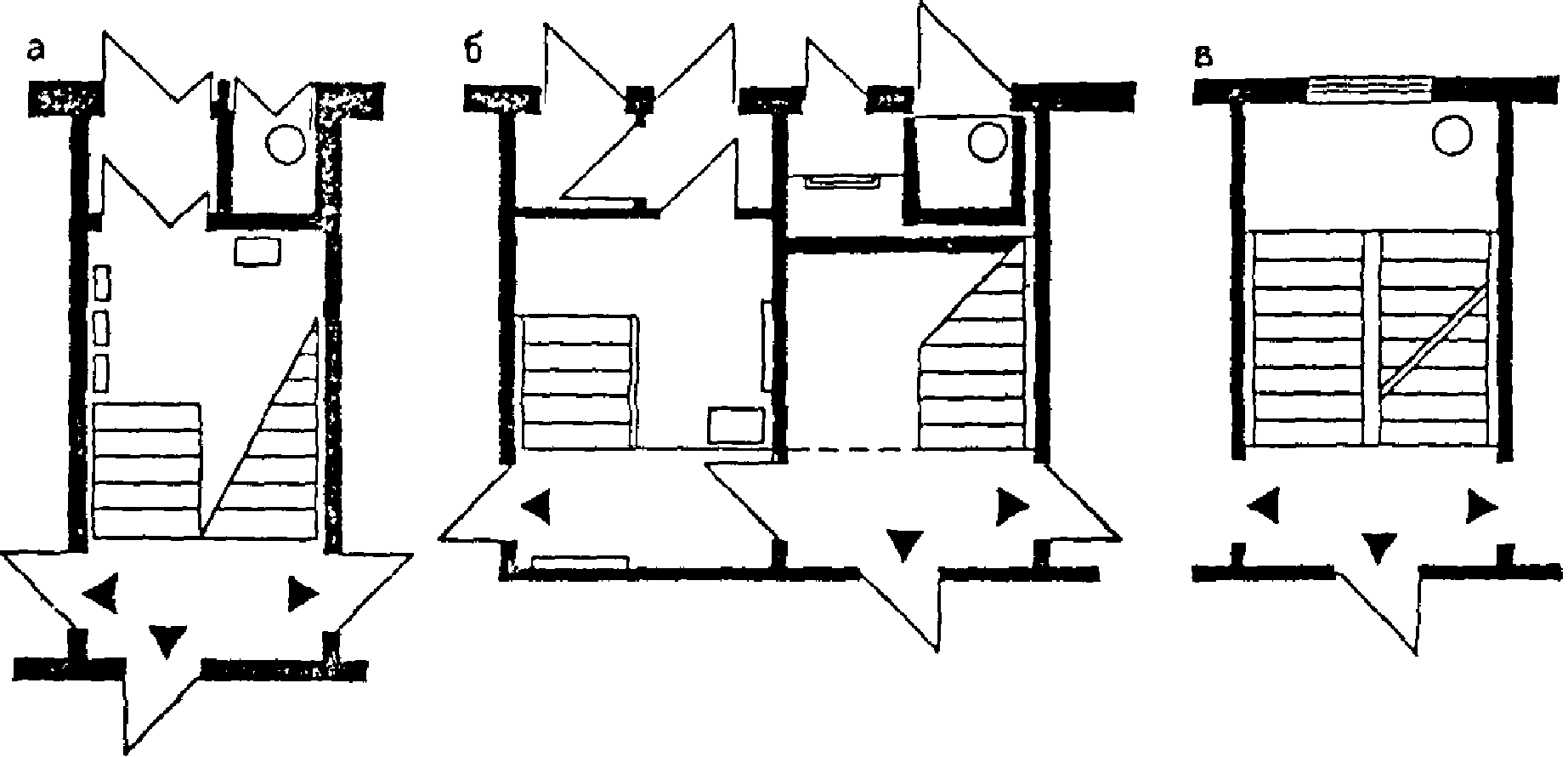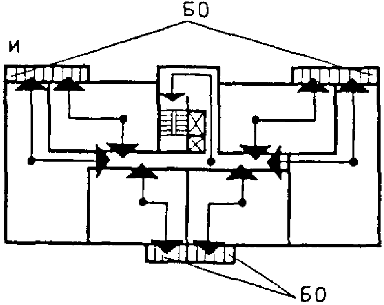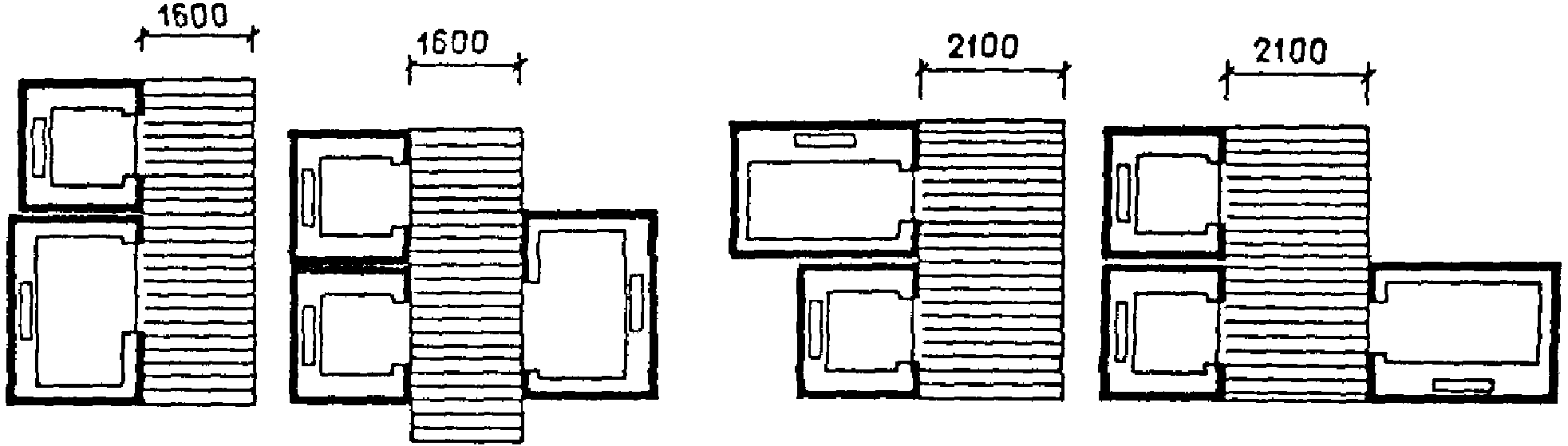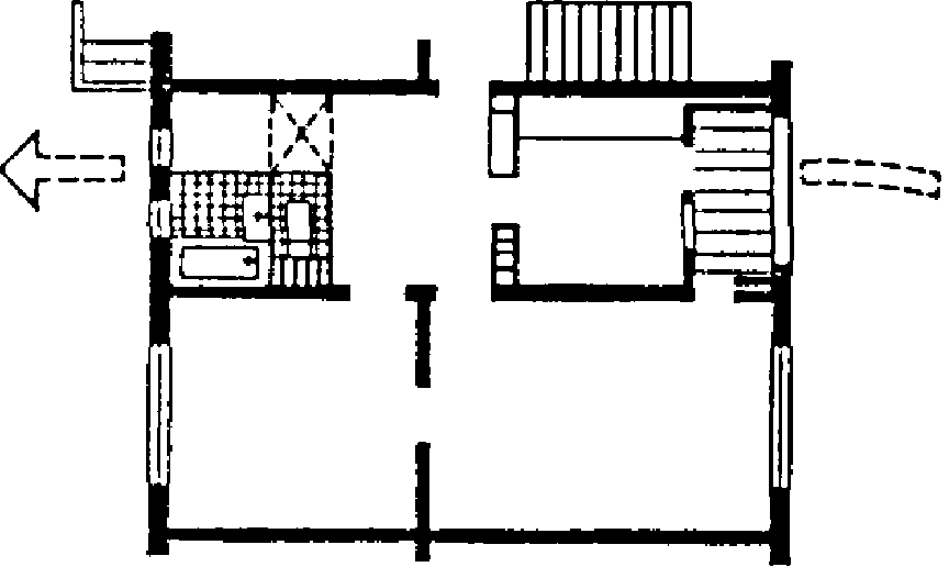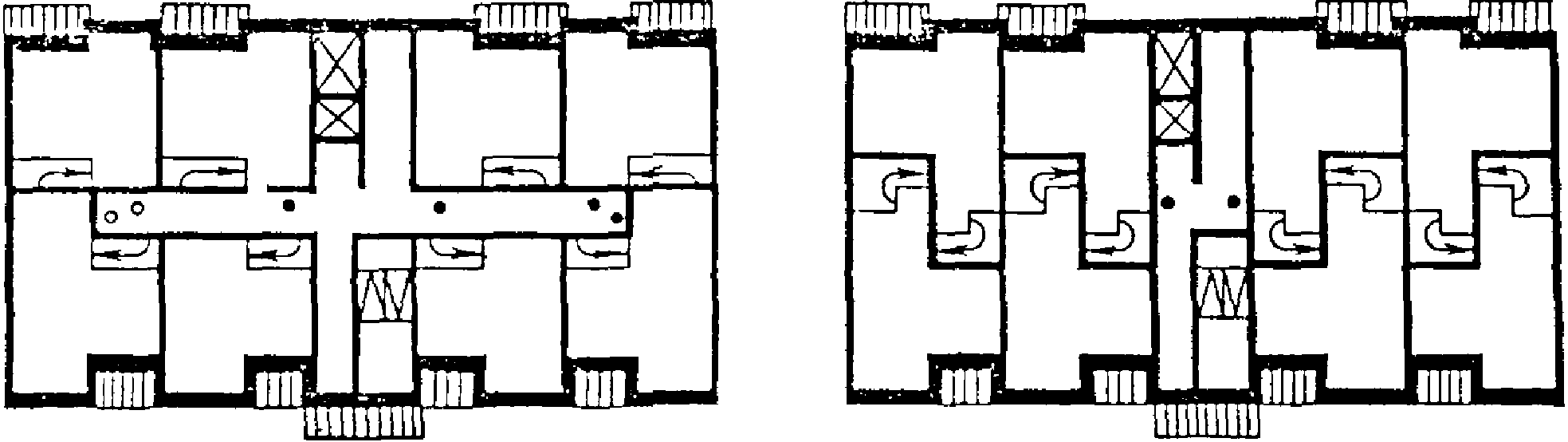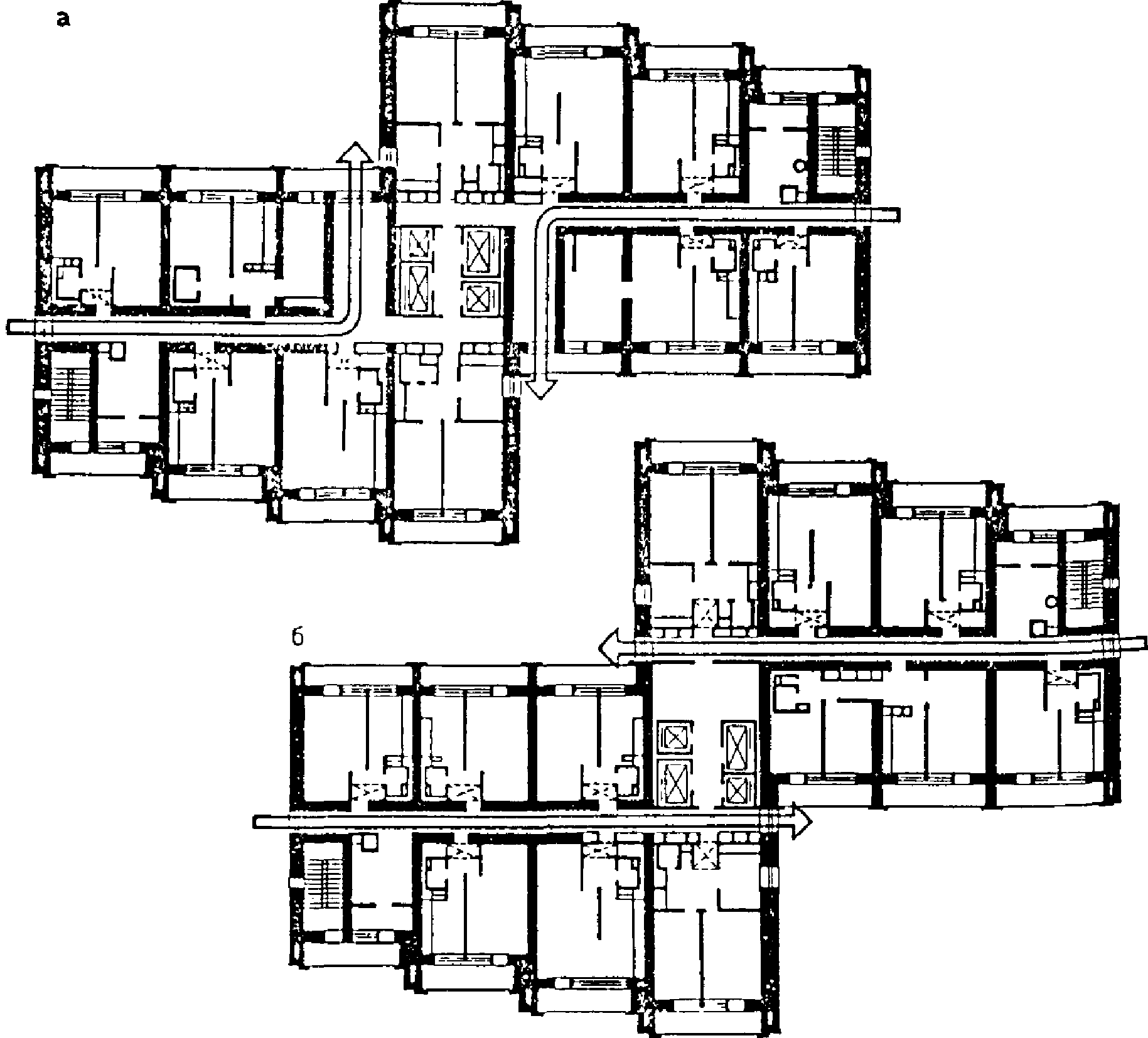 (рис. 9). Такая схема целесообразна для секций многосекционных домов и возможна для односекционных домов с Z-образной формой плана.