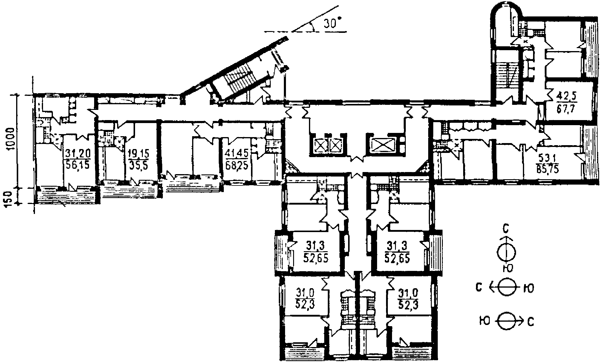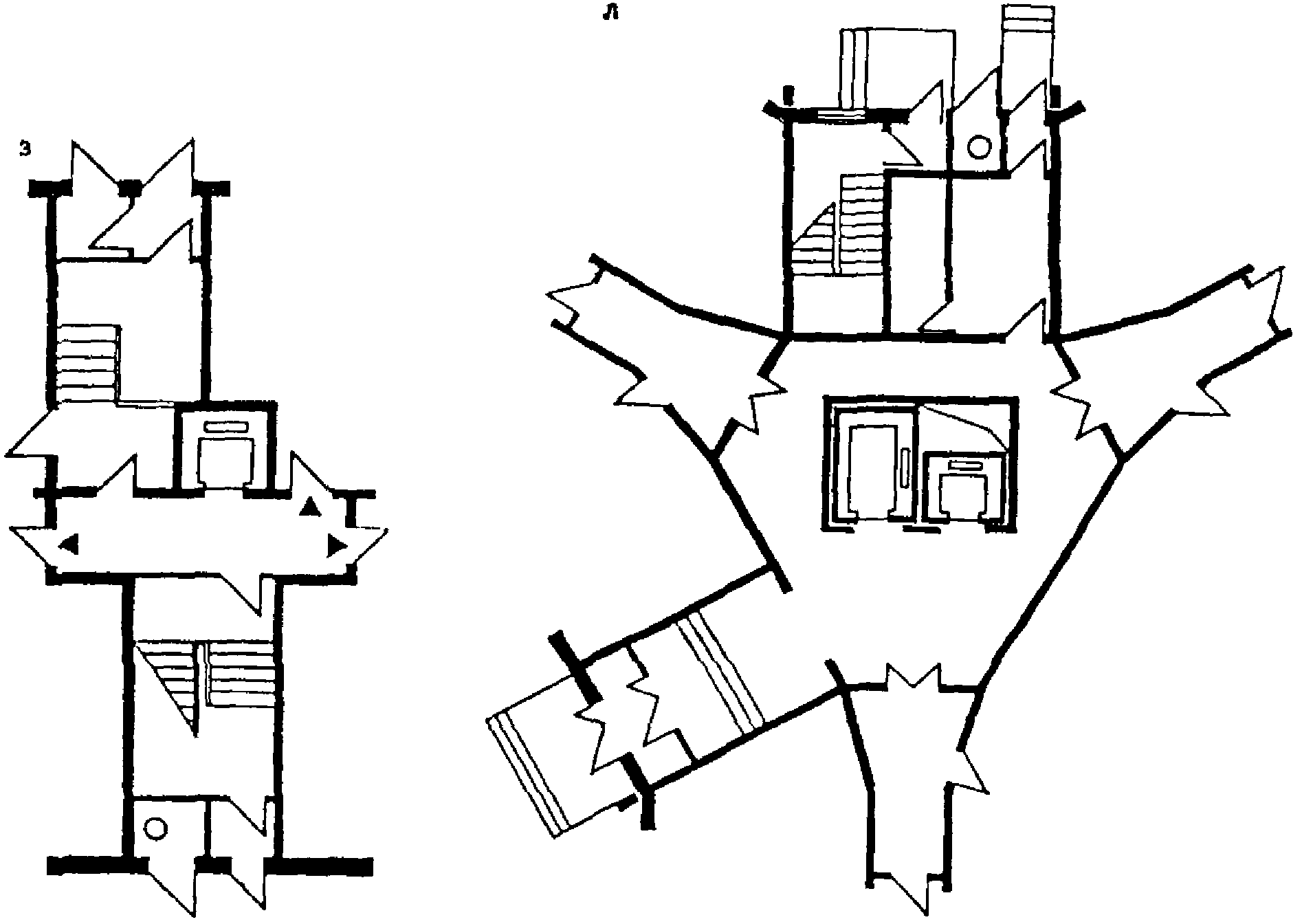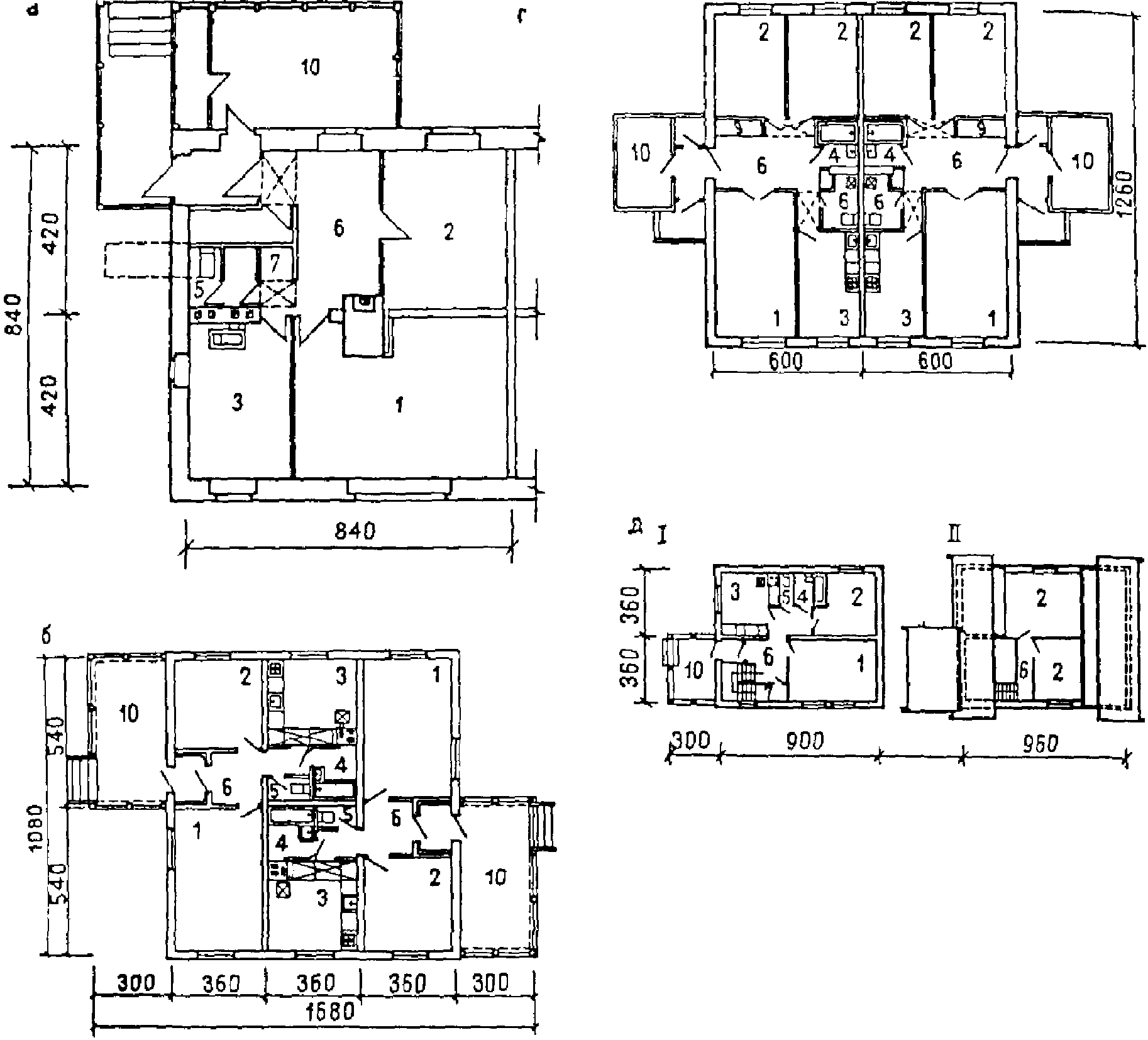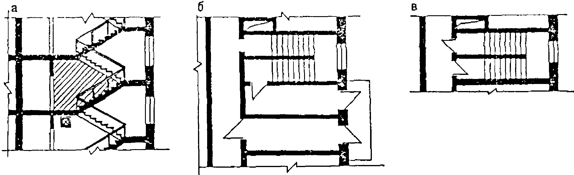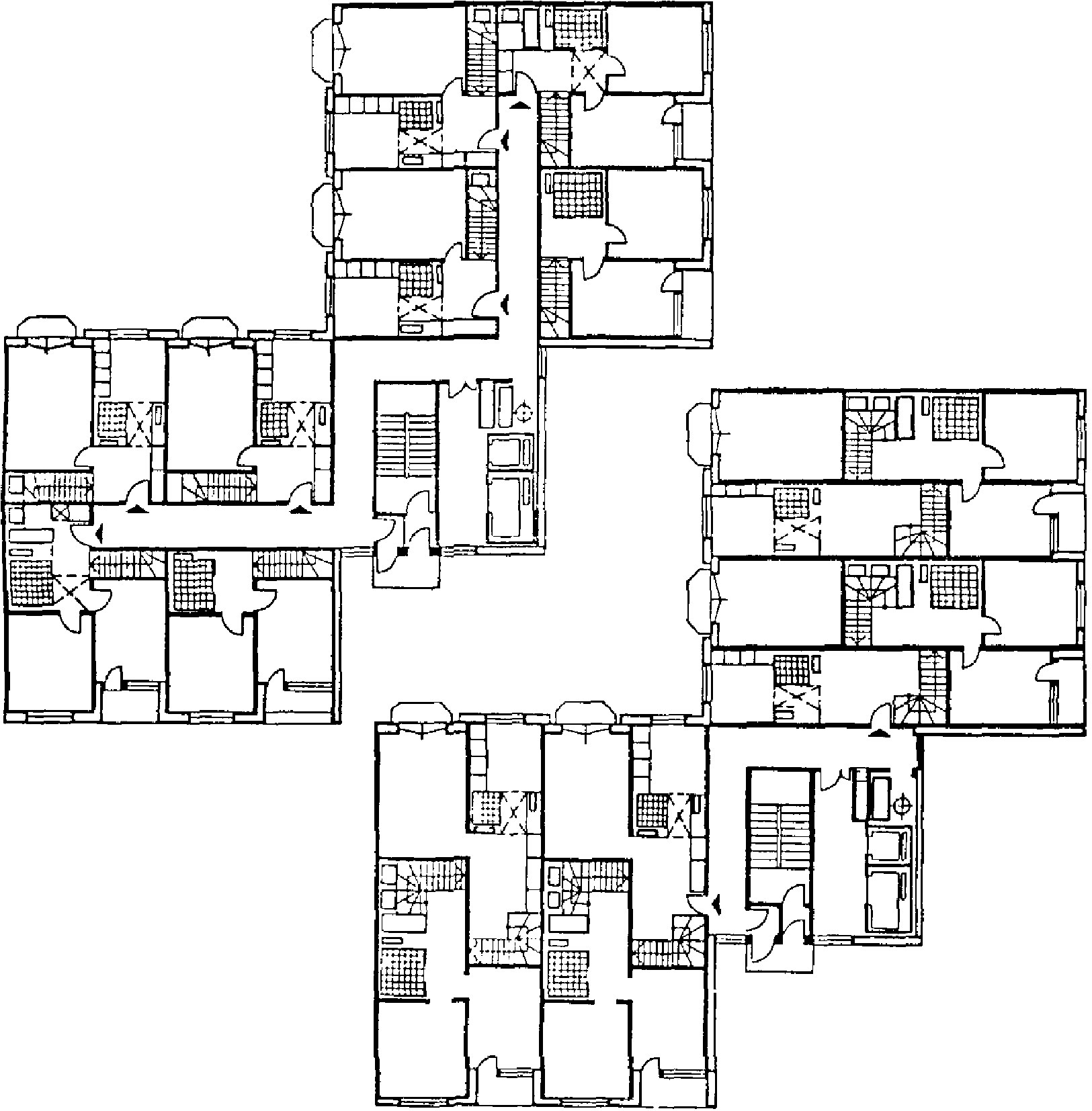 (рис. 9). Такая схема целесообразна для секций многосекционных домов и возможна для односекционных домов с Z-образной формой плана.
