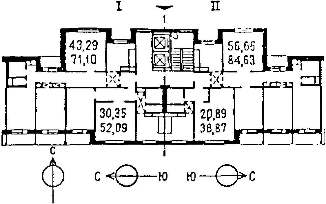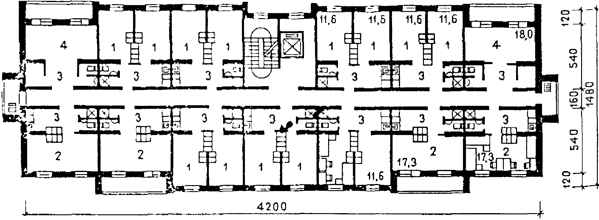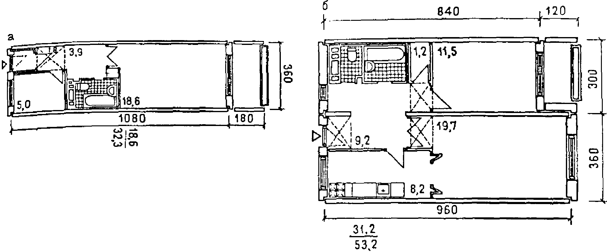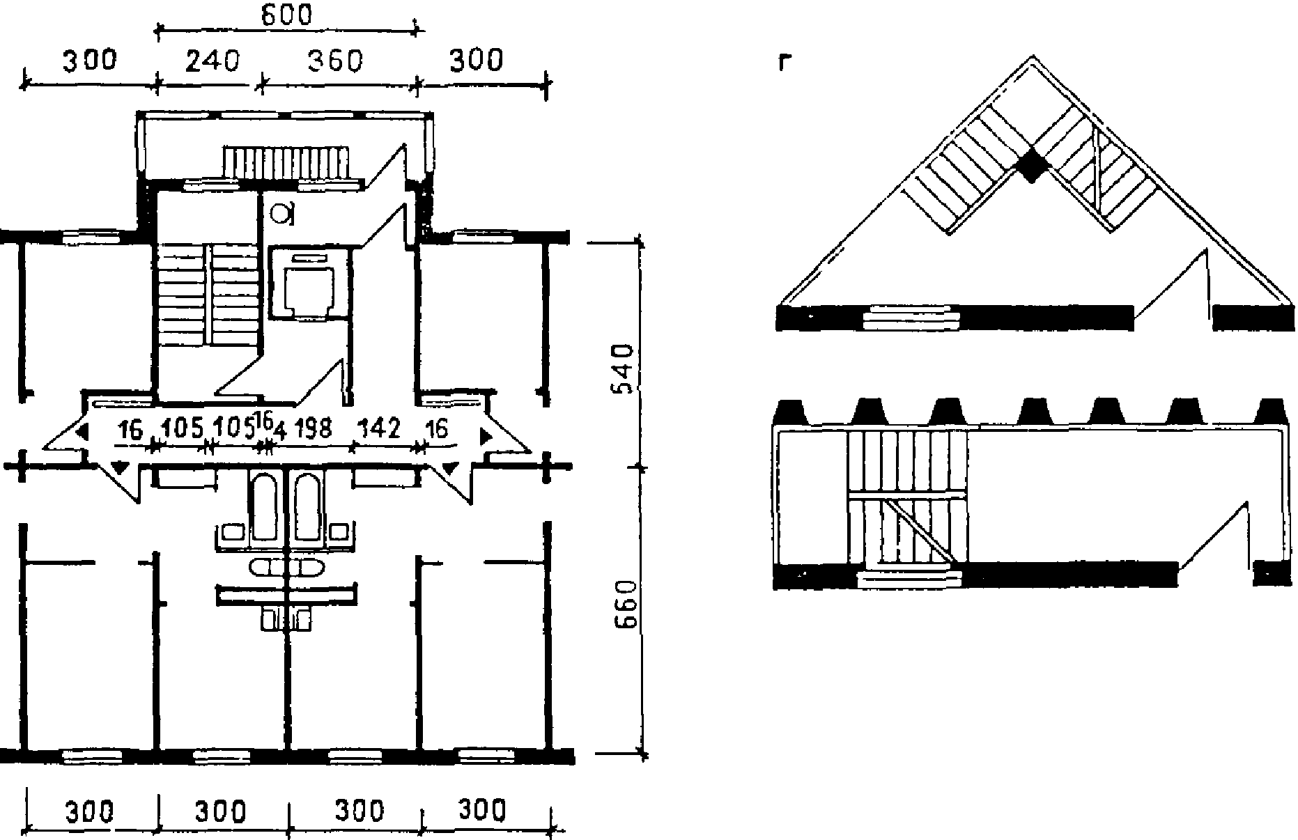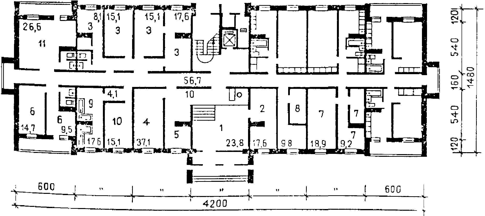 (рис. 9). Такая схема целесообразна для секций многосекционных домов и возможна для односекционных домов с Z-образной формой плана.