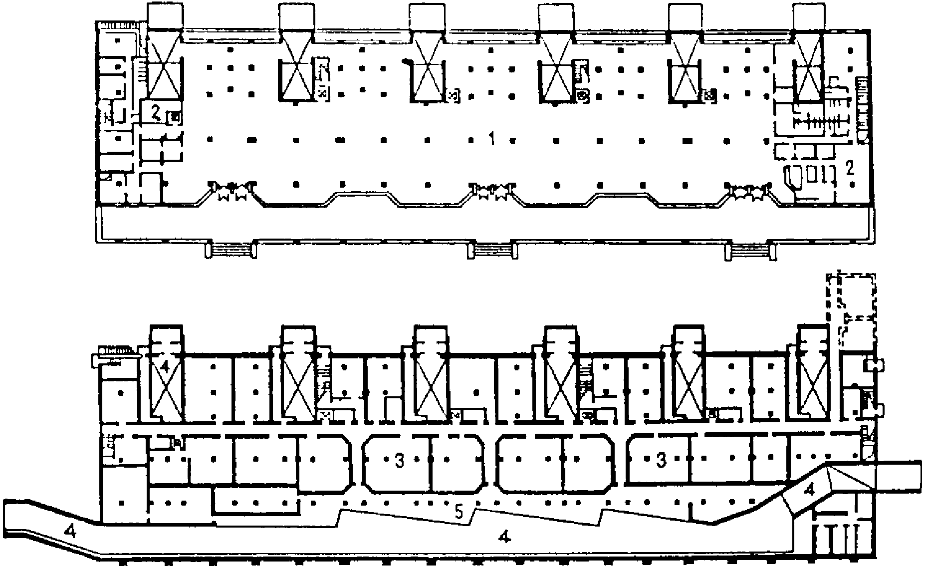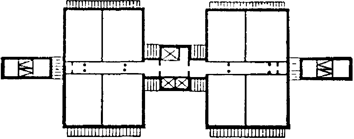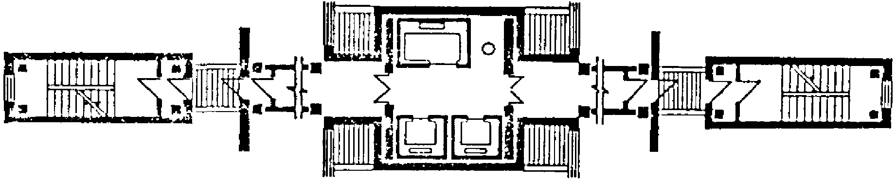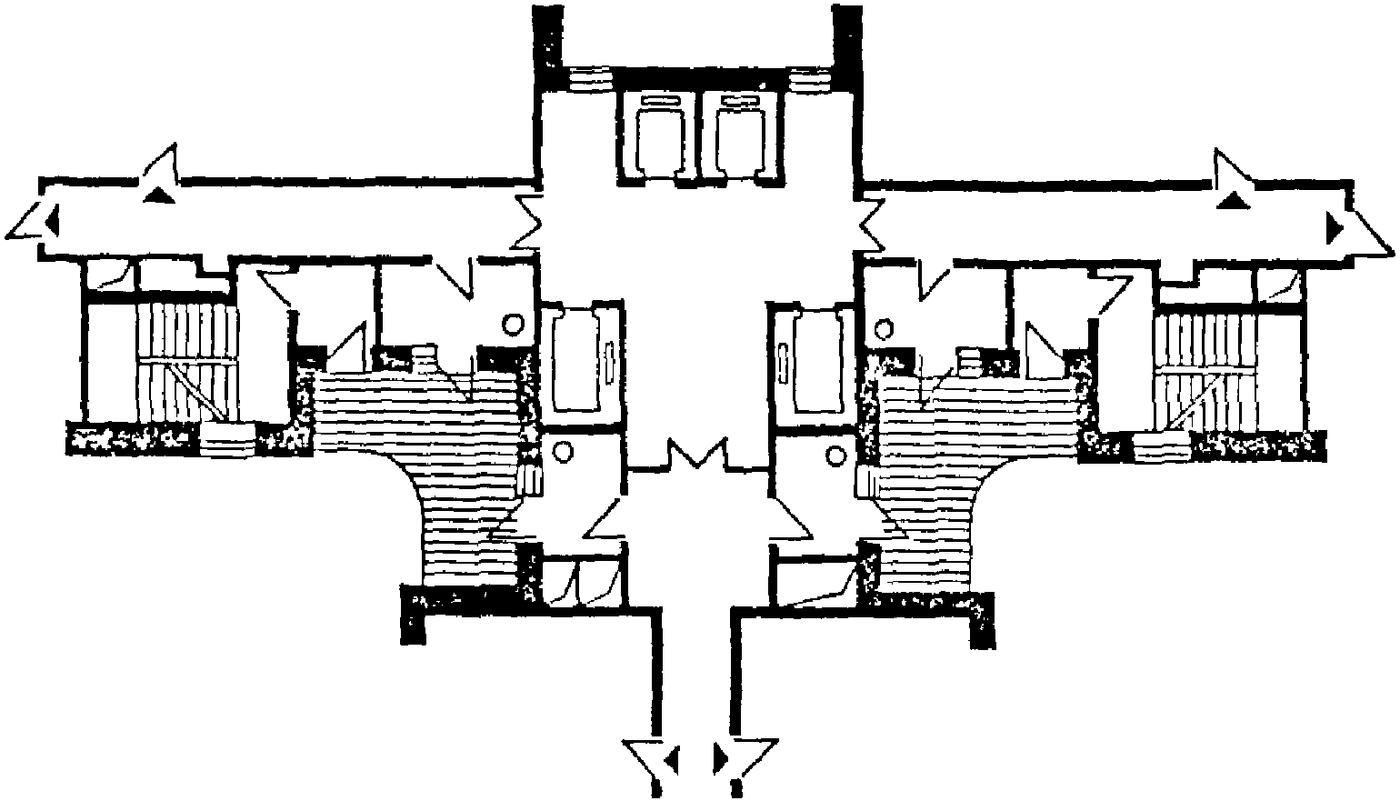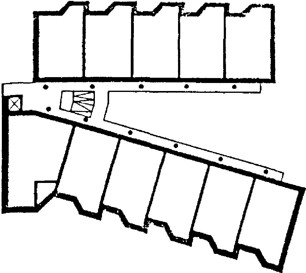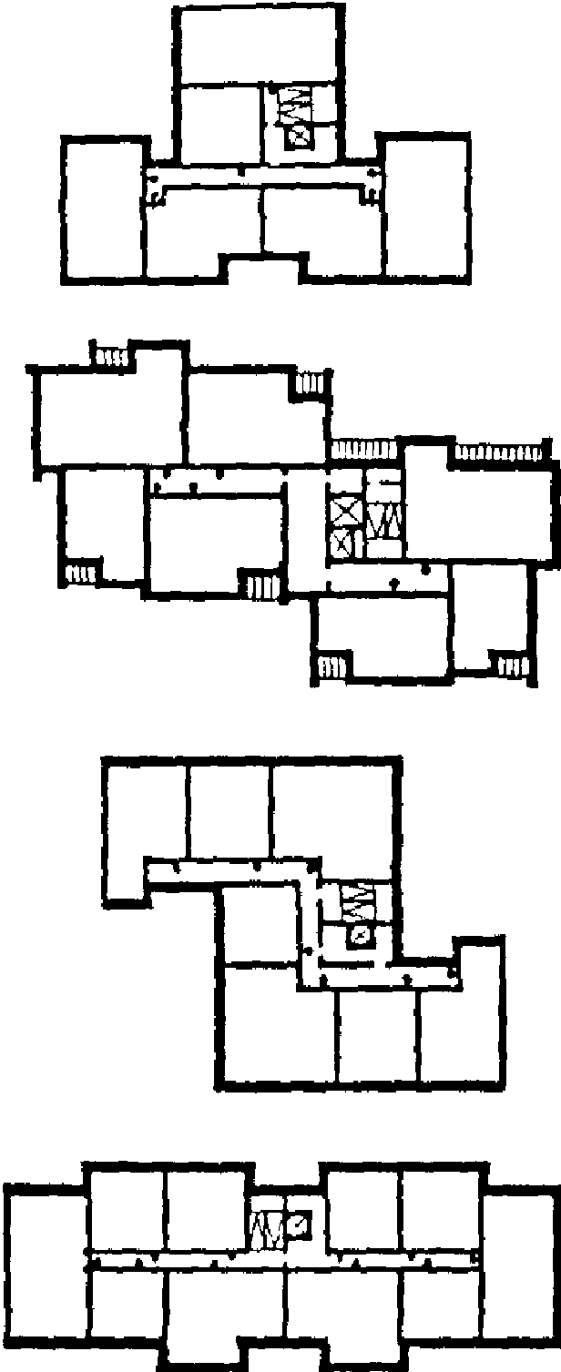 ГОСТ 5746-83, систему управления лифтами следует предусматривать смешанную собирательную при движении кабины вниз, предусматривающую наличие на каждом этаже одной кнопки вызова. При этом кабина лифта движется по приказам и может выполнять попутные остановки по вызовам при движении вниз. При движении вверх остановка лифта происходит только по приказам из кабины. Группу лифтов надлежит оснащать системой группового управления. С этой целью на каждом этаже устанавливается один вызывной кнопочный пост на группу лифтов. На появившийся вызов система группового управления направляет один из лифтов группы, что обеспечивает минимальное время ожидания, исключает движение на один вызов нескольких лифтов и улучшает эксплуатационные показатели лифтов. Лифты следует устанавливать выходами в общий лифтовый холл (рис. 8).