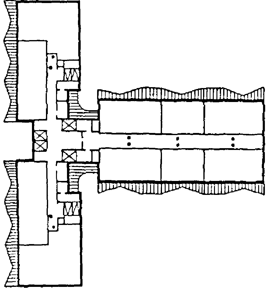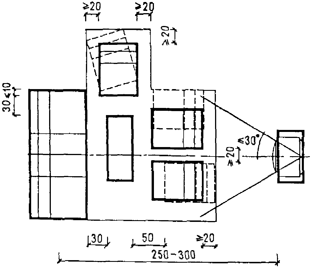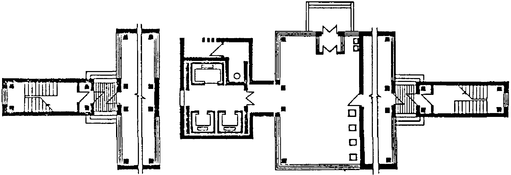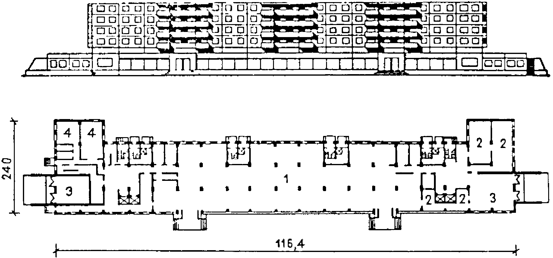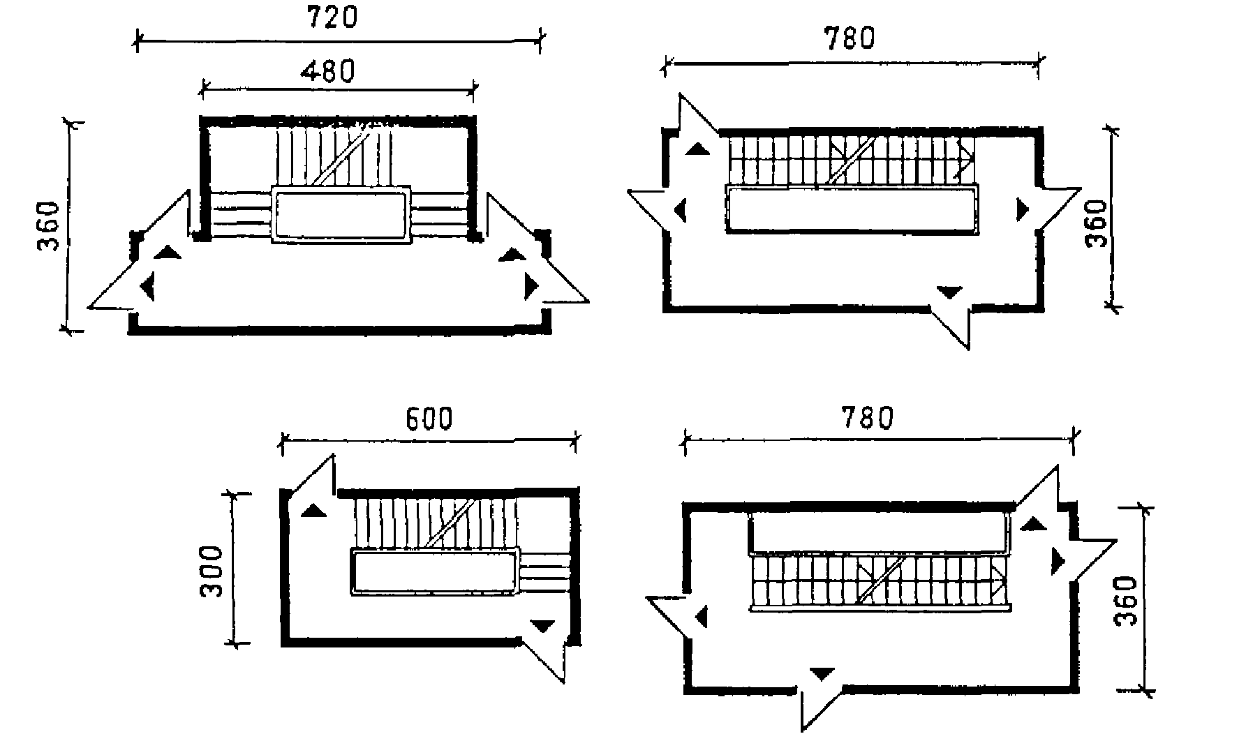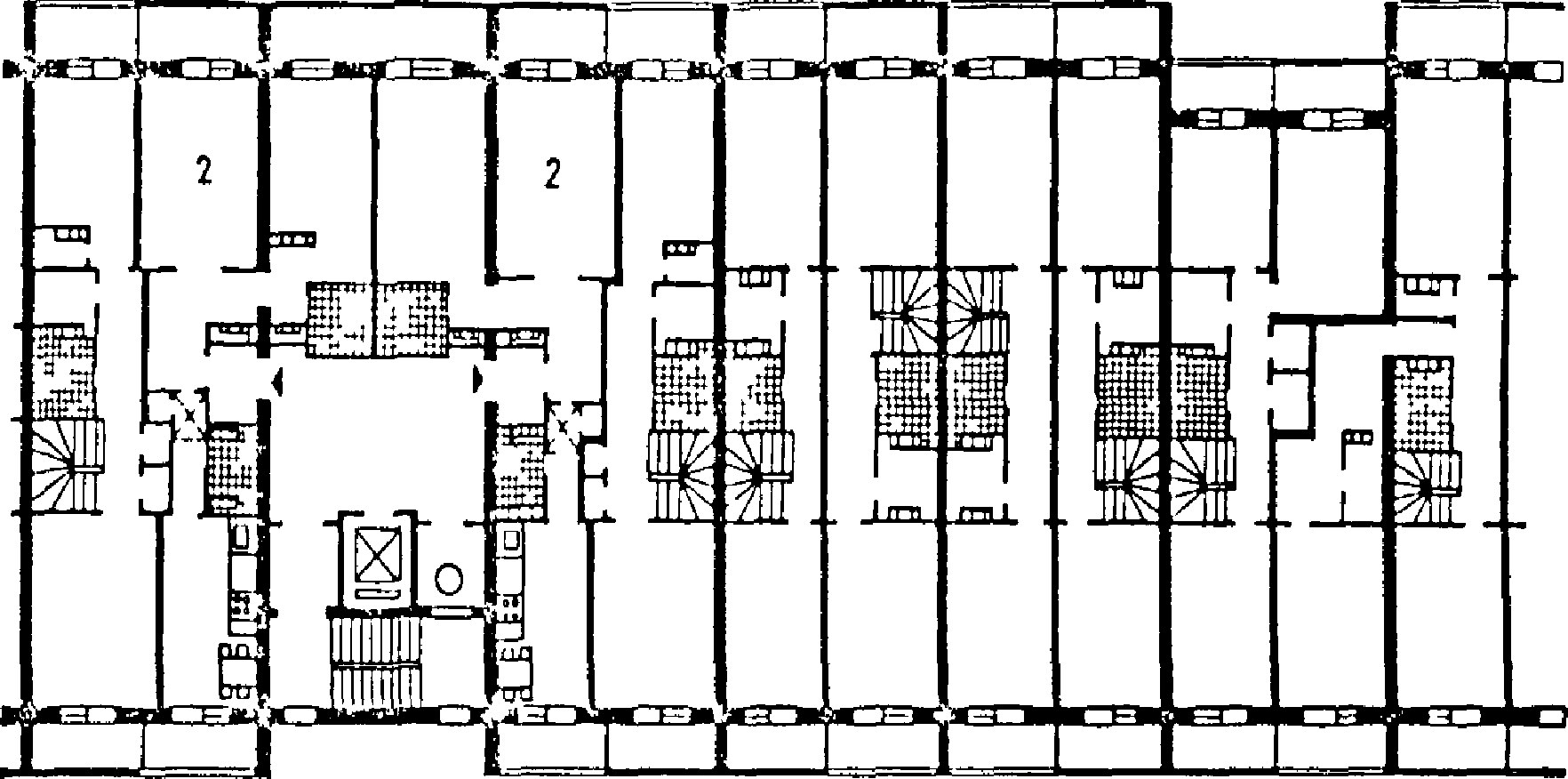 ГОСТ 5746-83, систему управления лифтами следует предусматривать смешанную собирательную при движении кабины вниз, предусматривающую наличие на каждом этаже одной кнопки вызова. При этом кабина лифта движется по приказам и может выполнять попутные остановки по вызовам при движении вниз. При движении вверх остановка лифта происходит только по приказам из кабины. Группу лифтов надлежит оснащать системой группового управления. С этой целью на каждом этаже устанавливается один вызывной кнопочный пост на группу лифтов. На появившийся вызов система группового управления направляет один из лифтов группы, что обеспечивает минимальное время ожидания, исключает движение на один вызов нескольких лифтов и улучшает эксплуатационные показатели лифтов. Лифты следует устанавливать выходами в общий лифтовый холл (рис. 8).