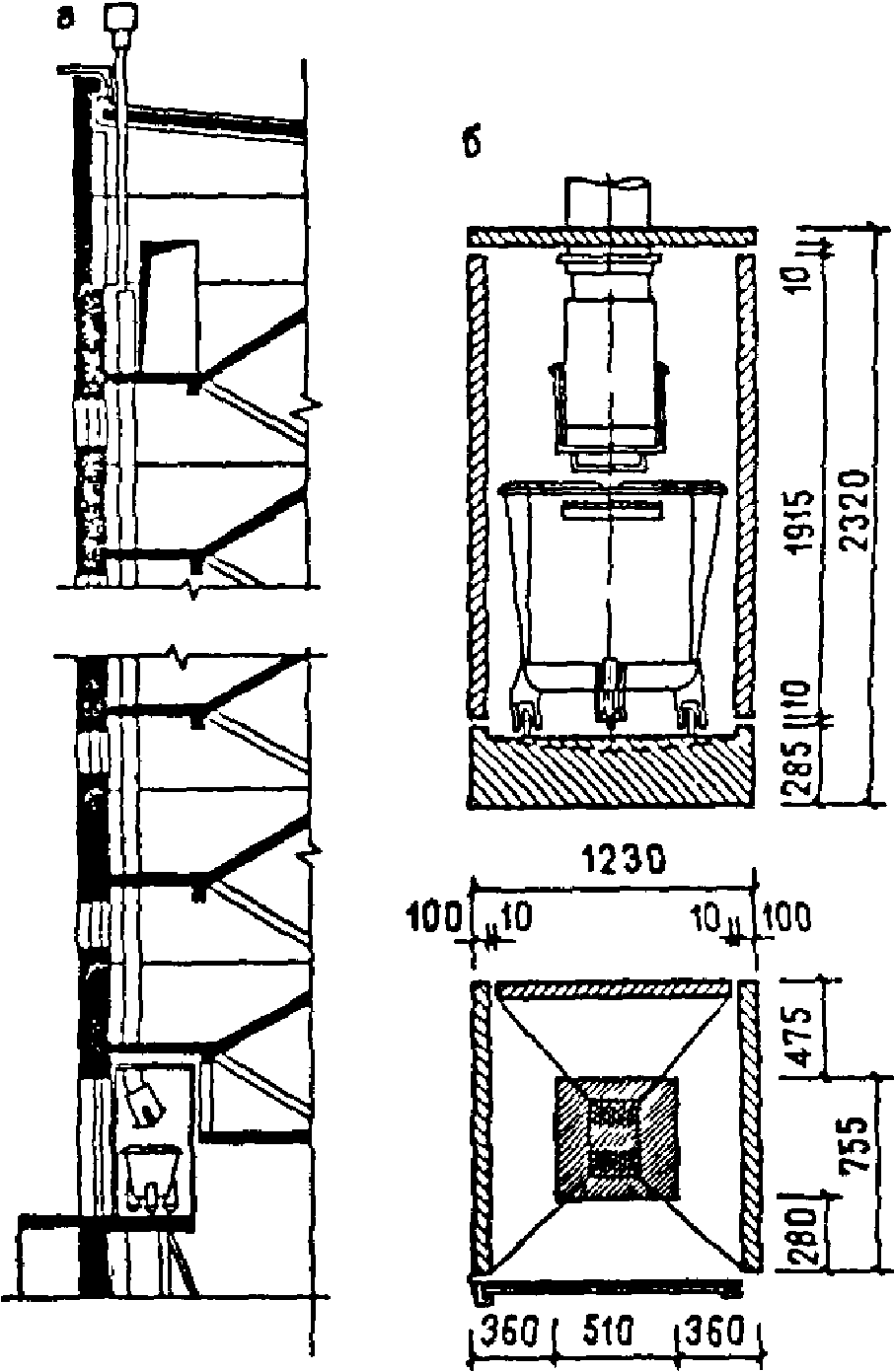 Мусоропровод можно располагать в любом месте лестнично-лифтового узла с учетом конкретного планировочного решения, удобства подхода и освещенности (рис. 5).