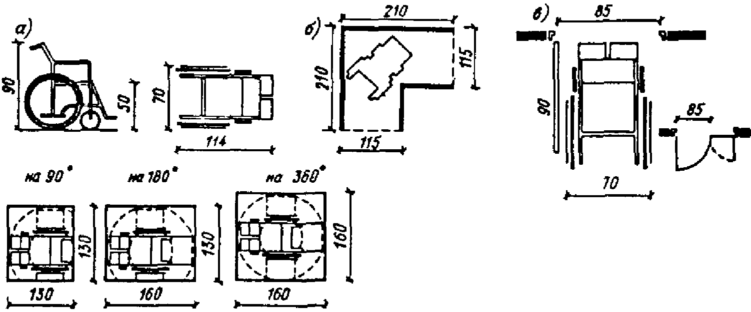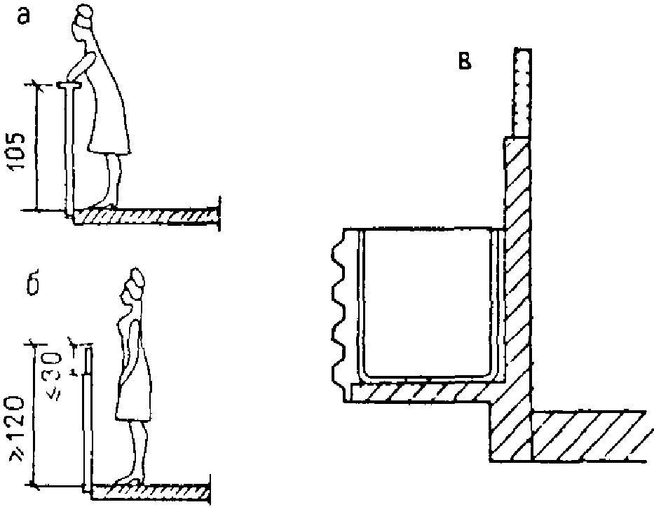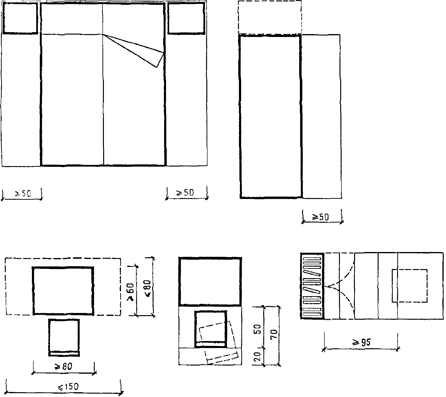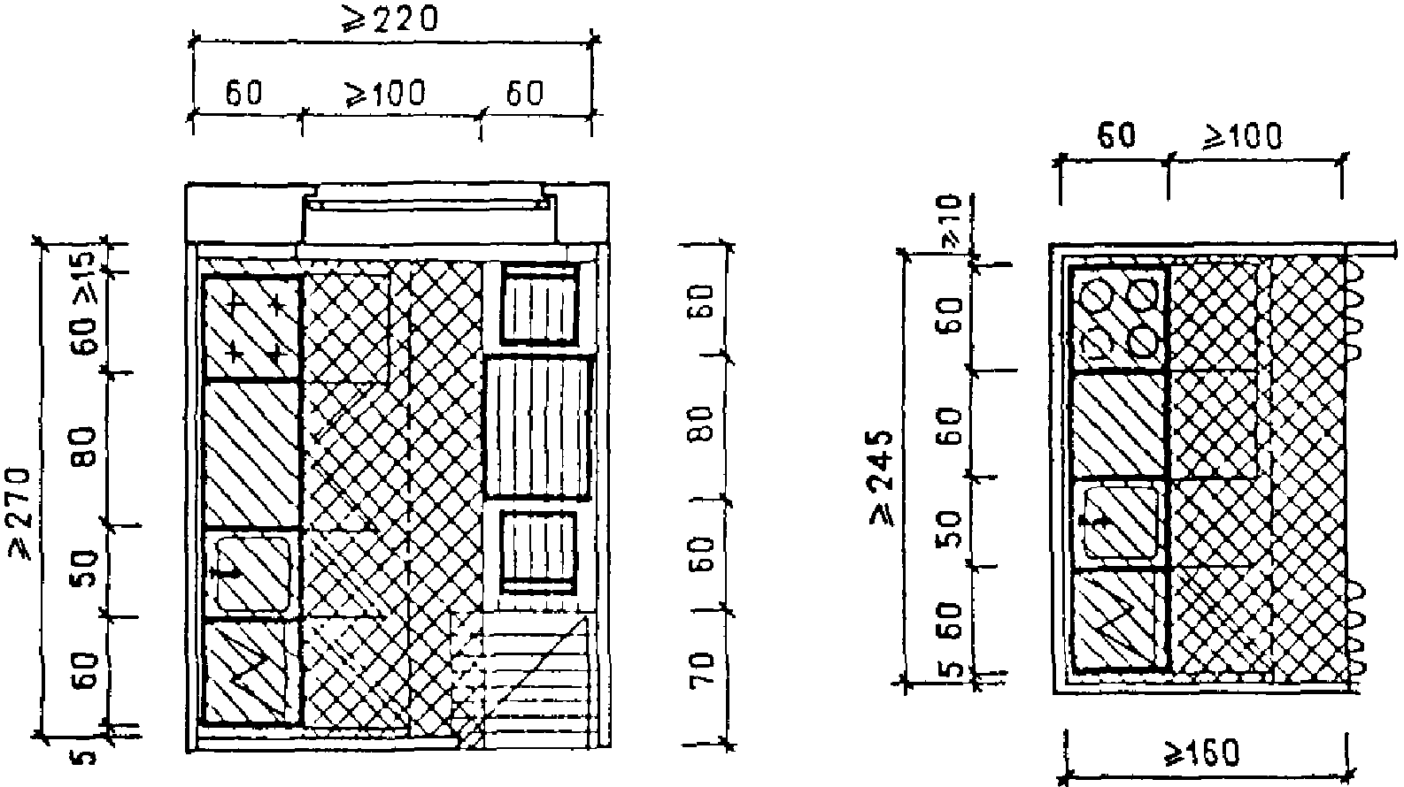 За ширину лифтового холла принимается расстояние от двери кабины до противоположной стены холла при однорядной компоновке или между дверями кабин противолежащих лифтов при двухрядной компоновке. При этом необходимо предусматривать возможность беспрепятственного проноса в кабину носилок и других крупногабаритных грузов. Транспортирование пожарных подразделений в зданиях 17 этажей и более обеспечивается установкой лифтов грузоподъемностью 630 кг со скоростью 1,6 м/с и размерами кабины 1100 x 2100 и 2100 x 1100 мм, которые, согласно