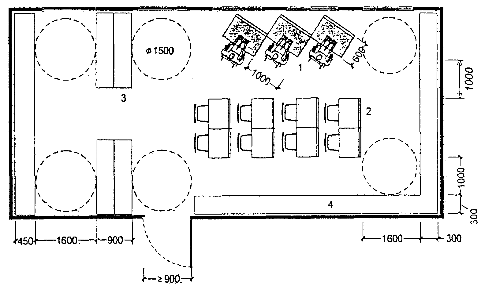 При проектировании бюро пропусков автономной группой помещений, зона ожидания должна включать в расчете на каждое рабочее место не менее двух стационарных мест сидения (возможно откидных) и резервную площадку для возможного размещения кресла-коляски (вне коммуникационной зоны).