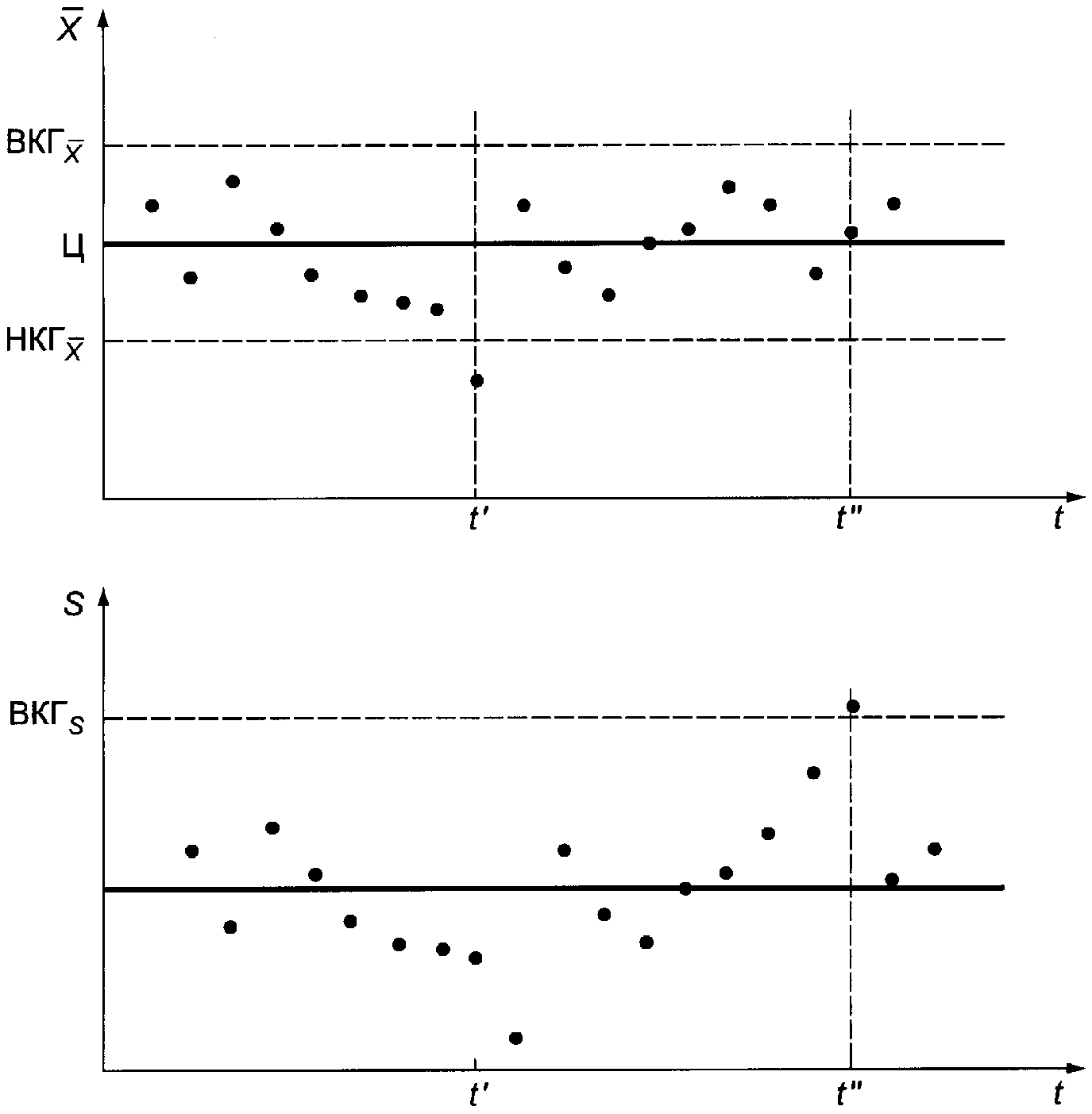 рисунок 1). Если все точки при этом не выходят за найденные контрольные границы, делают вывод, что ТП за наблюдаемый период времени находился в одном и том же статистически устойчивом состоянии, т.е. в соответствующий период времени особых факторов не было. Если же одна или несколько точек вышли за пределы контрольных границ, считают, что в соответствующие моменты времени происходило нарушение статистически устойчивого состояния, т.е. действовали особые факторы.