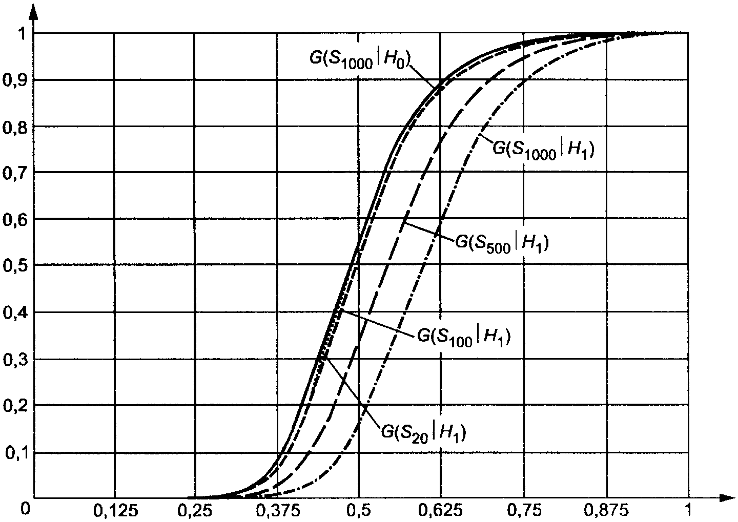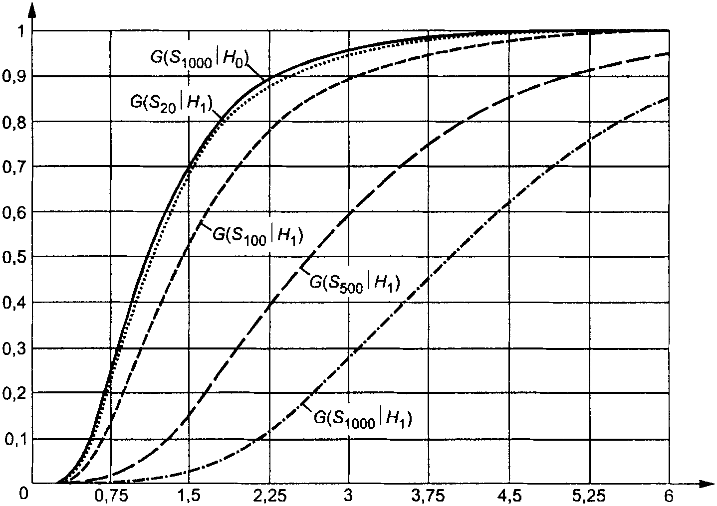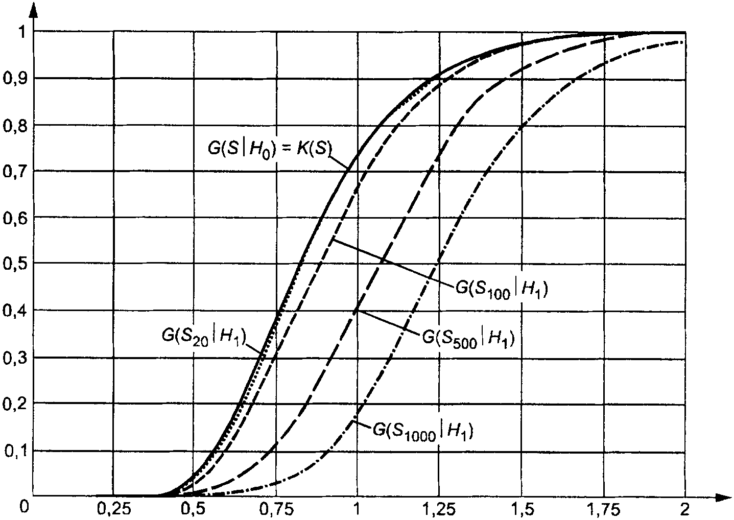 ], функция распределения статистики G(S|H1) также зависит от всех перечисленных факторов. Но в отличие от G(S|H0) распределение статистики G(S|H1) при справедливой гипотезе H1 очень сильно зависит от объема выборки n. Именно благодаря этому с ростом n повышается способность критериев различать гипотезы и возрастает мощность критериев.