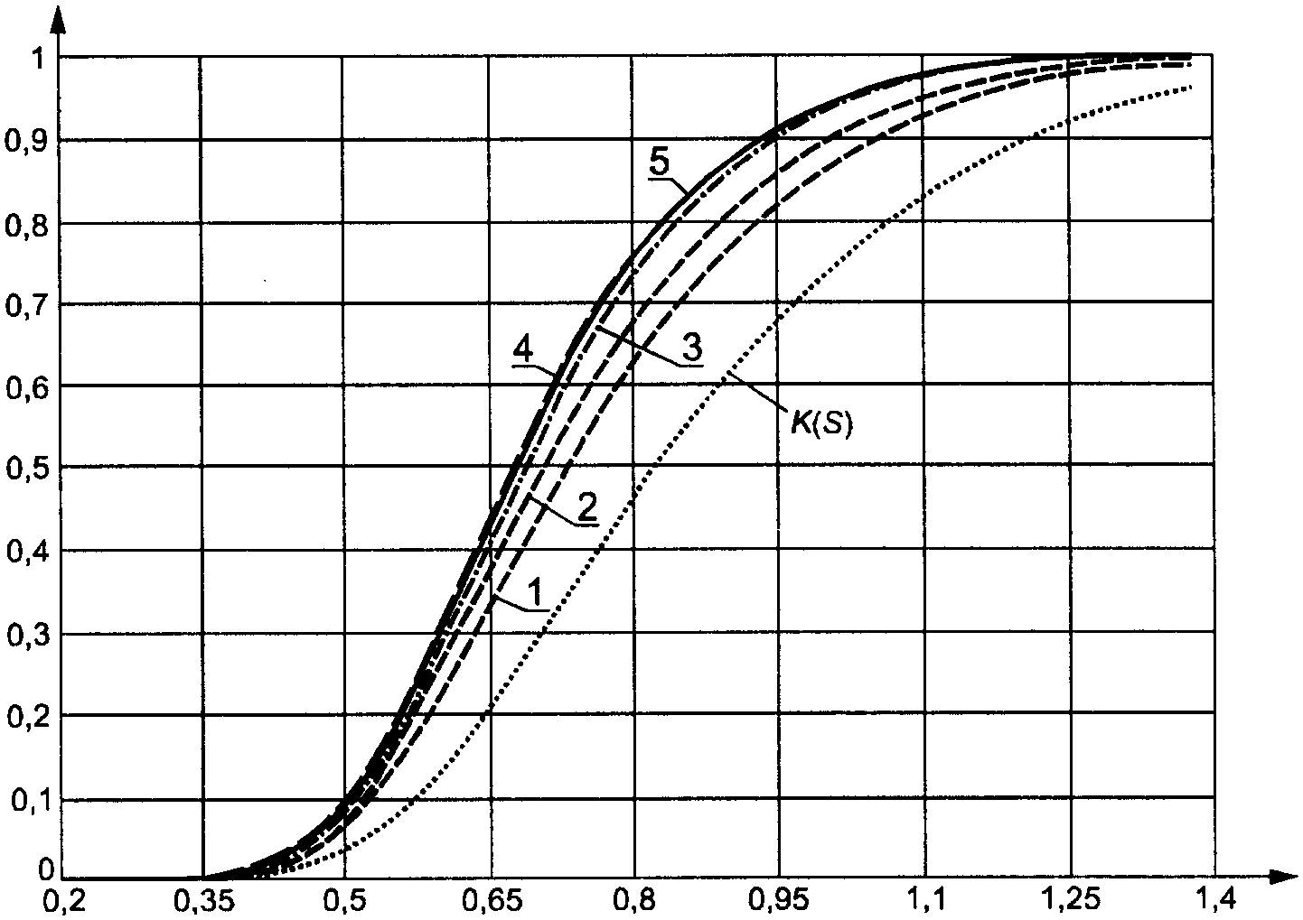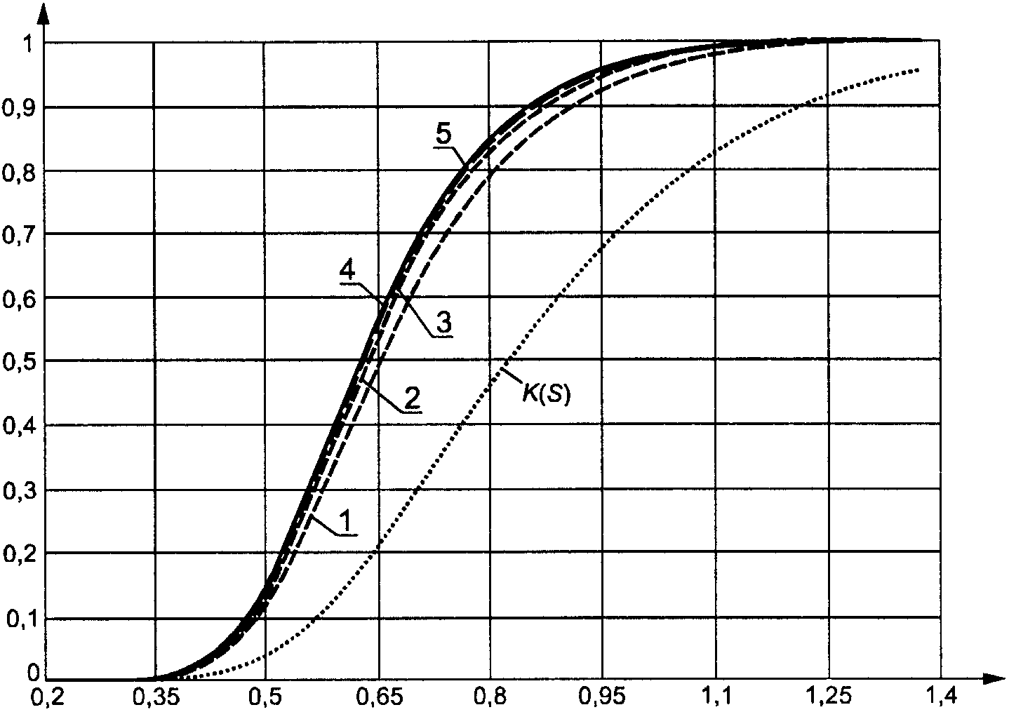 . О близости этих законов распределения можно судить по рисунку 4, на котором представлены их функции распределения. Рисунок 5 иллюстрирует зависимость от n распределений G(Sn|H1) статистики SK Колмогорова при проверке простой (n = 20, 100, 500, 1000), а рисунок 6 - при проверке сложной гипотезы H0 (при использовании ОМП).