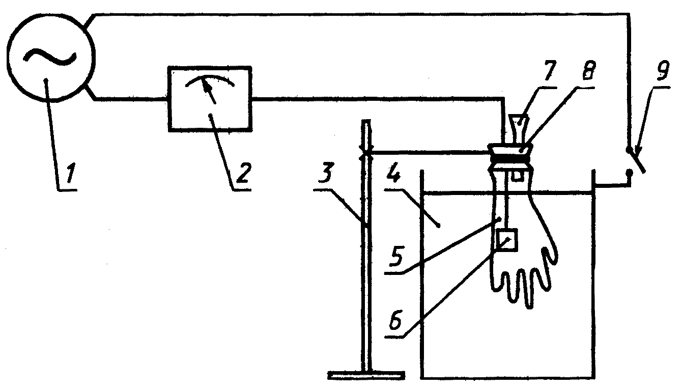 5 - испытуемая перчатка; 6 - электрод; 7 - воронка для