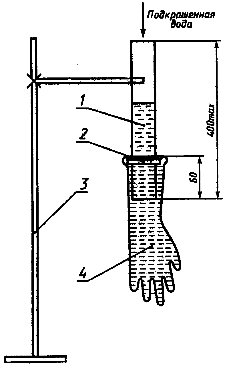 В цилиндр наливает 1000 см3 питьевой воды (или 1000 см3 подкрашенной водорастворимым красителем питьевой воды) комнатной температуры, не допуская попадания ее на внешнюю поверхность перчатки.