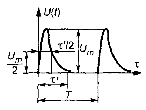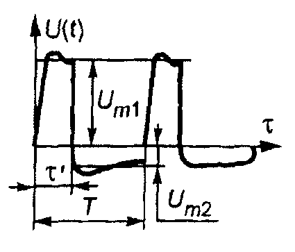 |  и  - максимальные значения напряжения при аппроксимации положительной и отрицательной полуволн импульса, В; T - период повторения импульсов, с;  - частота, Гц;  - отношение максимального значения напряжения к минимальному;  - скважность;  - длительность импульса с большей амплитудой, с. Прямоугольная: | где  или |
