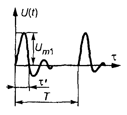 |  - амплитуды полуволн, В;  - длительность полуволны в импульсе, с; T - период повторения импульсов, с. Затухающая синусоида  , где  - частота колебаний в импульсе |  , где n - количество полуволн, учитываемое в расчете с амплитудой не менее  |