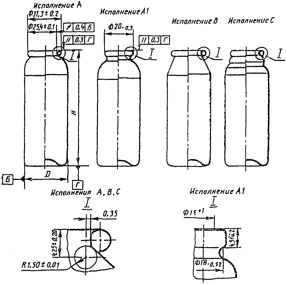 Номер баллона | Исполнения | D (пред. откл. +/- 0,2) | H (пред. откл. +/- 0,5) | Ориентировочная вместимость, см3 |