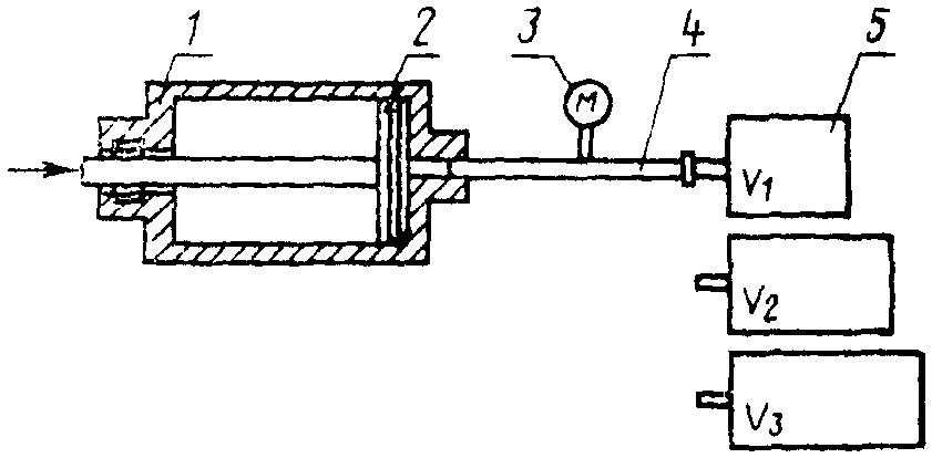 соединяют поочередно с рабочим цилиндром через манометр (3) и передвигают поршень (2) в крайнее правое положение.