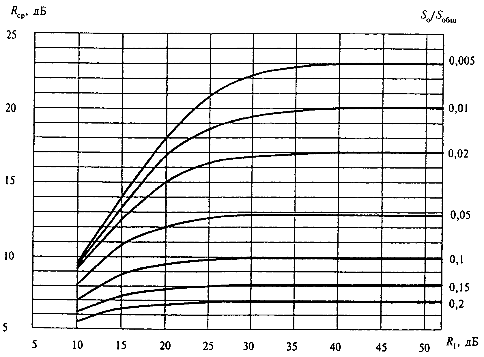 Возможно определять среднюю изоляцию воздушного шума такого ограждения по рисунку 14 в зависимости от величины звукоизоляции ограждения (глухой его части)
