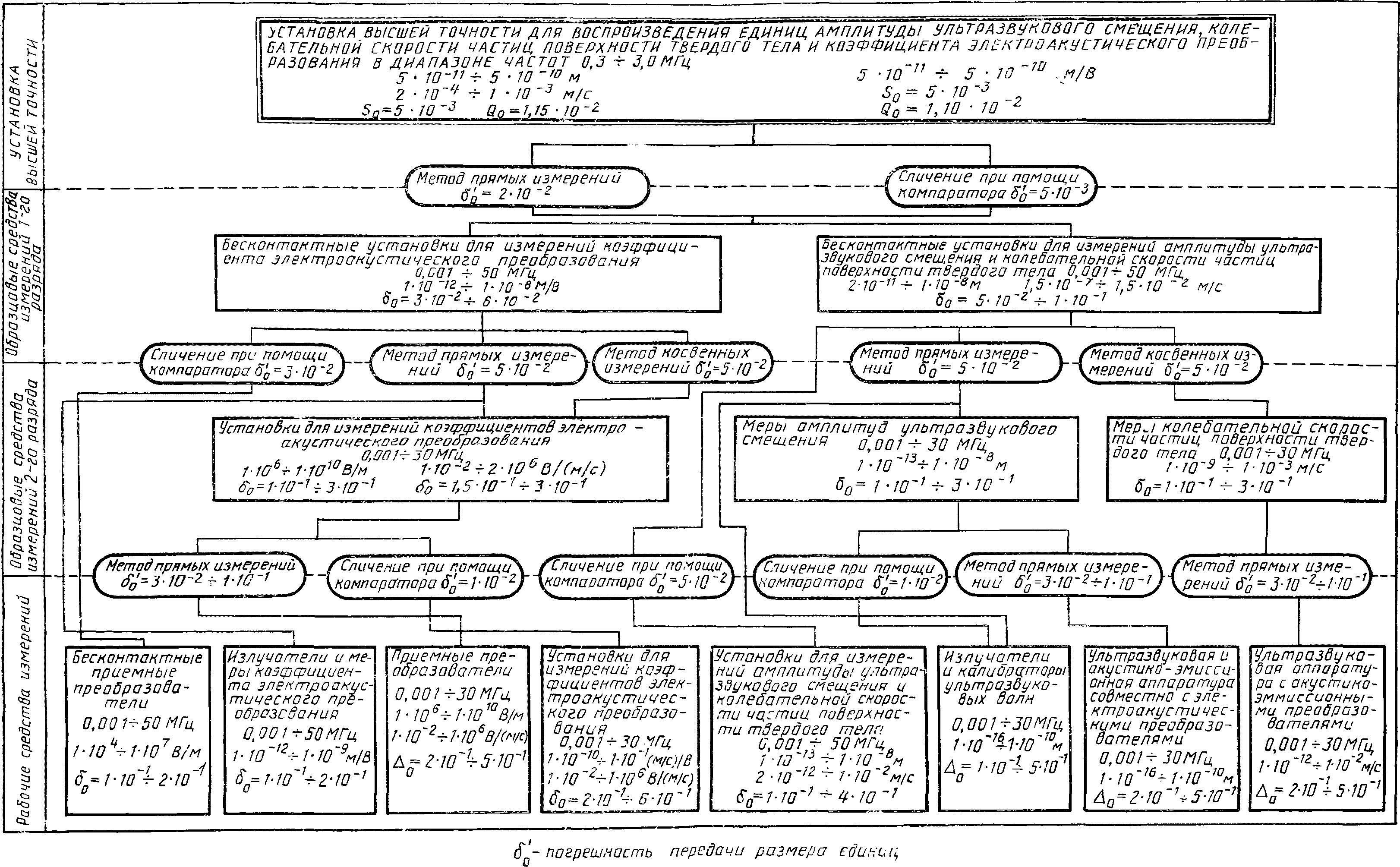 Настоящая рекомендация распространяется на государственную поверочную схему для средств измерений амплитуды ультразвукового смещения, колебательной скорости частиц поверхности твердого тела и коэффициентов электроакустического преобразования в диапазоне частот 0,001 - 50 МГц и устанавливает назначение установки высшей точности для воспроизведения единиц амплитуды ультразвукового смещения - метра (м), колебательной скорости частиц поверхности твердого тела - метра в секунду (м/с) и коэффициента электроакустического преобразования - метра на вольт (м/В) в диапазоне частот 0,3 - 3,0 МГц, комплекс основных средств измерений, входящих в ее состав, основные метрологические характеристики установки высшей точности и порядок передачи размера данных единиц от установки высшей точности при помощи образцовых средств измерений рабочим средствам измерений с указанием погрешностей и основных методов поверки.