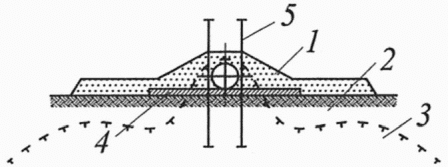 III Наземный способ с термоохладителями 1 - насыпь; 2 - талый грунт основания насыпи; 3 - мерзлый грунт основания насыпи; 4 - теплоизоляция; 5 - термоохладители | Преимущества: меньшая вероятность повреждений; стабильность (относительная) внешней среды; отсутствие анкерных устройств; технологичность строительства; меньшие (по сравнению с подземной прокладкой) затруднения при наблюдении и ремонте. Недостатки: дополнительные наблюдения за термоохладителями | II группа местности для горячих участков в комбинации с теплоизоляцией. I группа местности при холодных участках с применением теплоизоляции и обвалования |