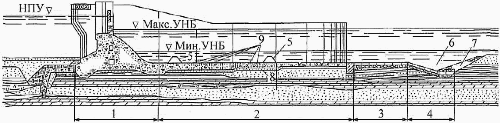 рельефа и геологического строения русла в верхнем и нижнем бьефах сооружения.
