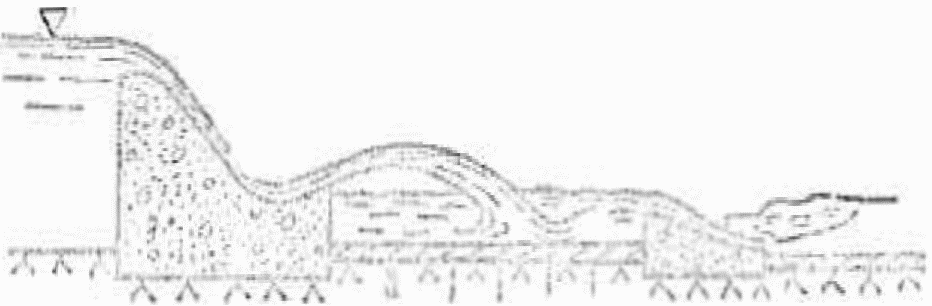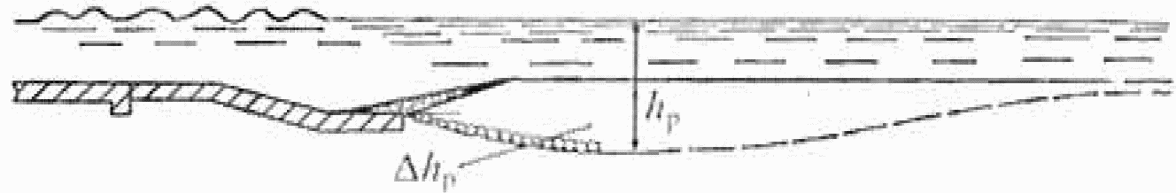 3.5 сопряжение бьефов: Слияние потока, пропускаемого через водопропускное сооружение, с нижележащим водным объектом - нижним бьефом сооружения.