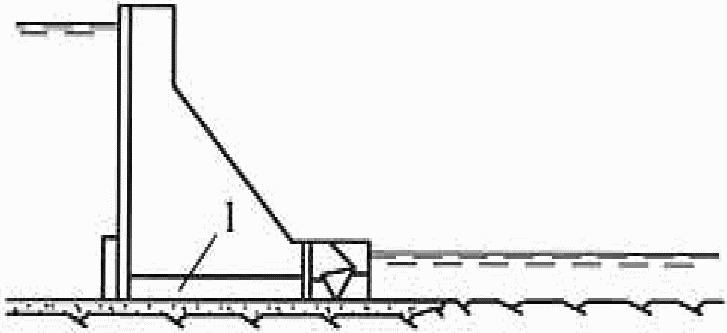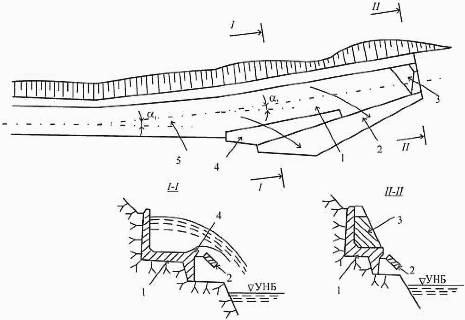 3.7 концевое устройство: Элемент конструкции водосброса, обеспечивающий заданный режим течения на участке сопряжения с нижним бьефом (крепление дна нижнего бьефа, носок-трамплин, уступ).
