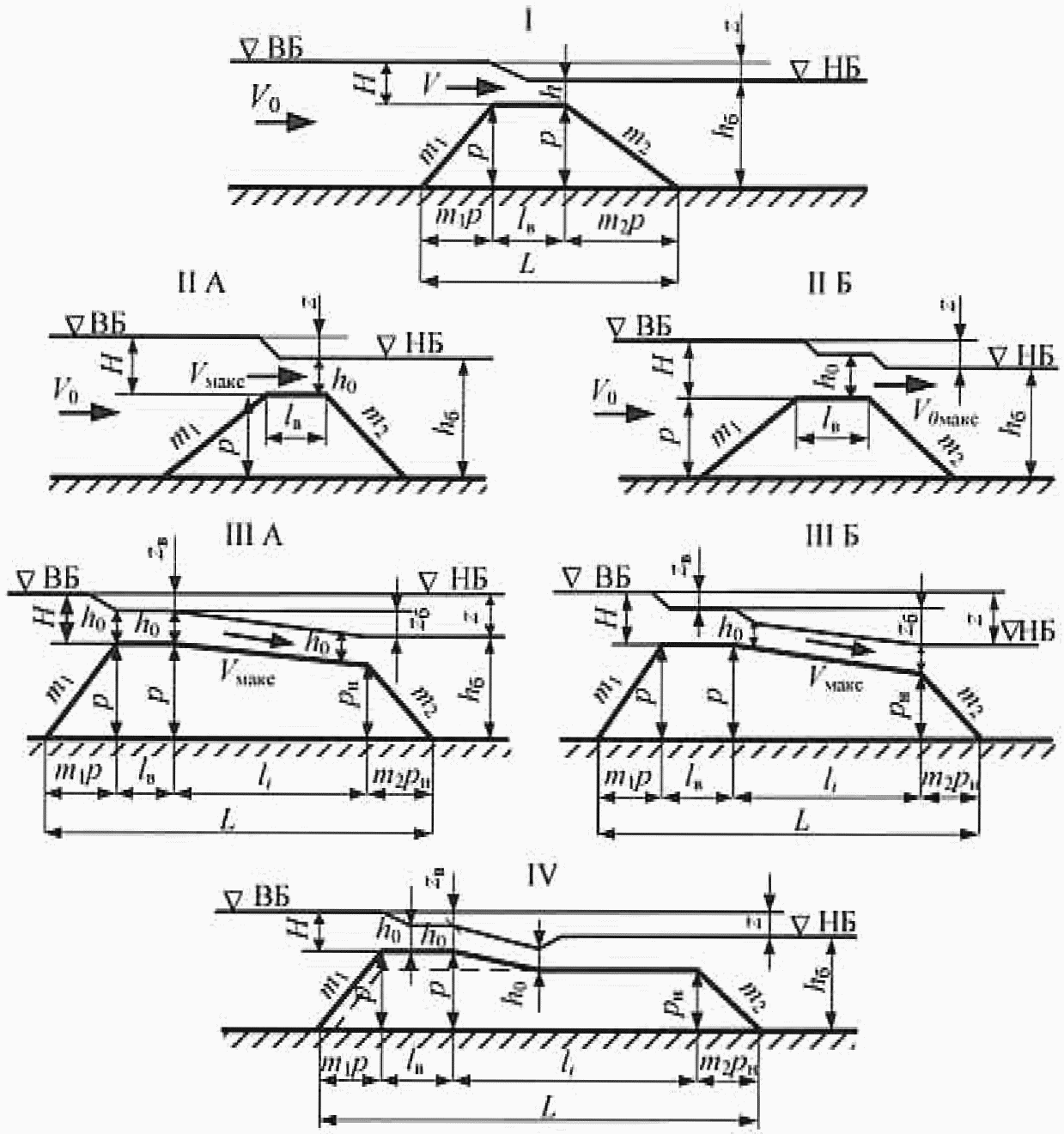 Пропускную способность переливных секций следует определять, относя их к тому или иному типу водосливов в зависимости от ширины гребня, высоты и очертания верховой и низовой граней.