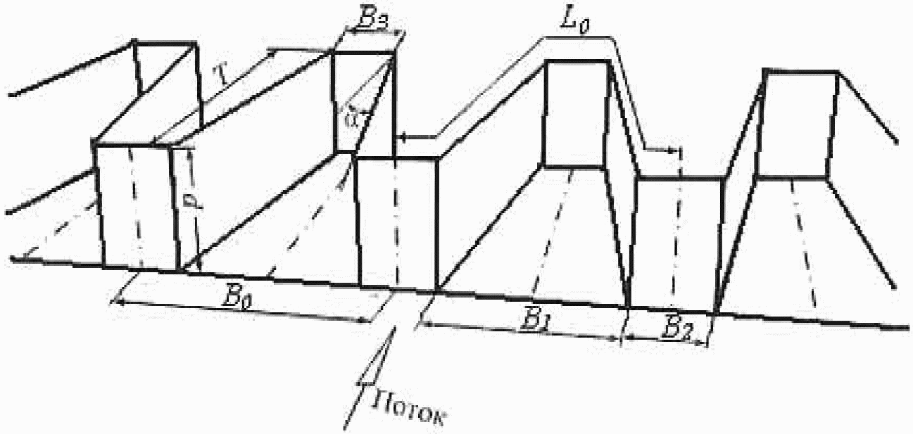 Число пролетов гребенки с пониженным порогом, их размеры и отметки порогов должны определяться значением пропускаемого расхода и перепадом Z, при котором происходит перекрытие русла, а также объемом блоков бетонирования и высотой перекрывающих их затворов. При этом следует обеспечить условия пропуска ледохода, учитывая, что при достаточной для прохода льдин ширине пролетов, глубина может оказаться недостаточной, и льдины будут оседать на пороге, образуя заторы.