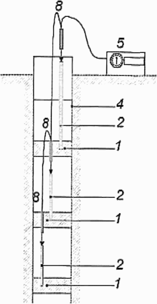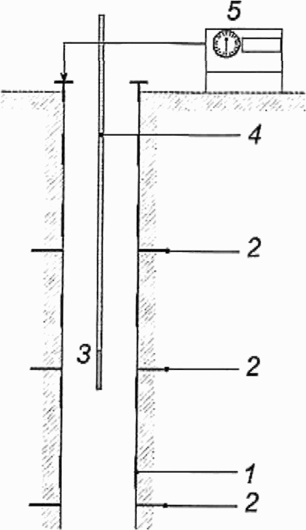<1> Контроль выполняют при проходке с открытым забоем с водопонижением. <2> Контроль выполняют по специальному заданию. <3> Контроль выполняют при подработке с целью добычи полезных ископаемых. Примечание - Поверхностные грунтовые марки закладывают по профильным линиям, которых должно быть не менее двух. |