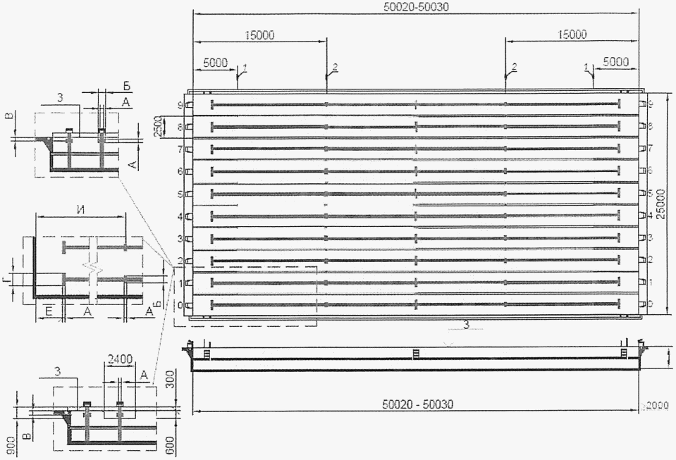 Размеры ванн, м | Произвольно, но не более 60 м2 | 25 x 10 - 16 | Произвольно | 50 x 25 25 x 25 25 x 16 | 50 x 25 25 x 25 25 x 16 | 50 x 25 30 x 25 | 30 x 25 | 50 x 25 | 36 x 25 | 25 x 25 | 25 x 20 |