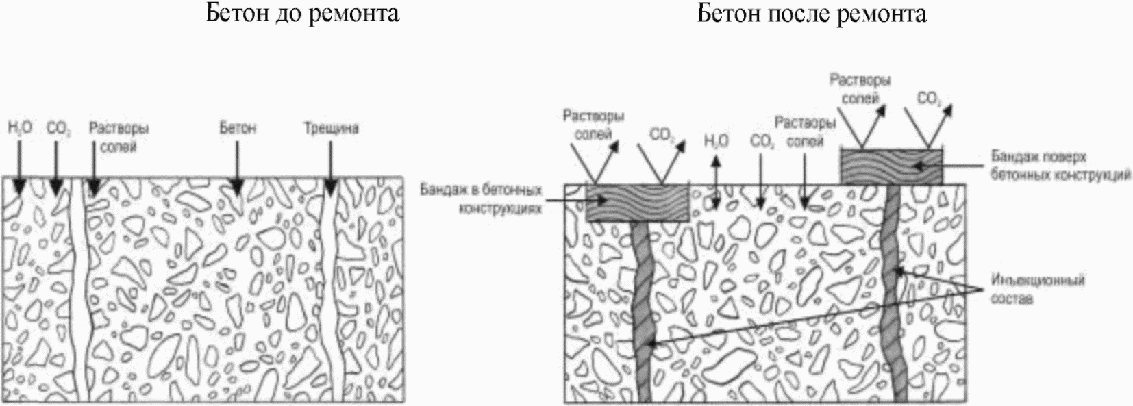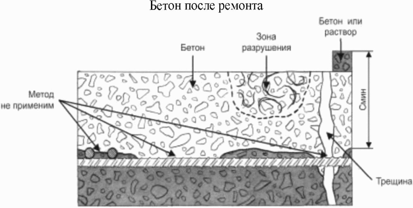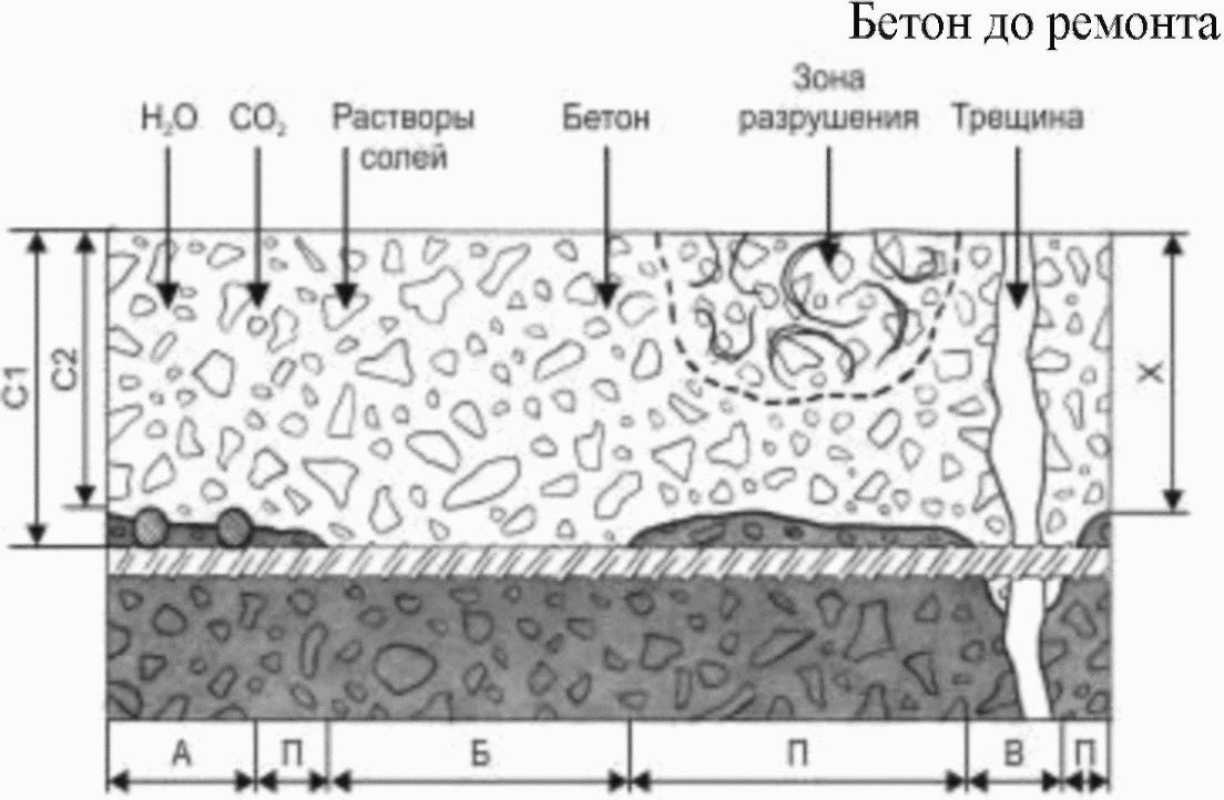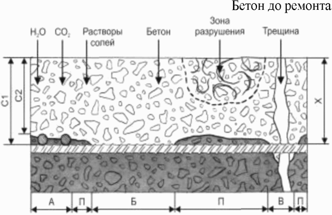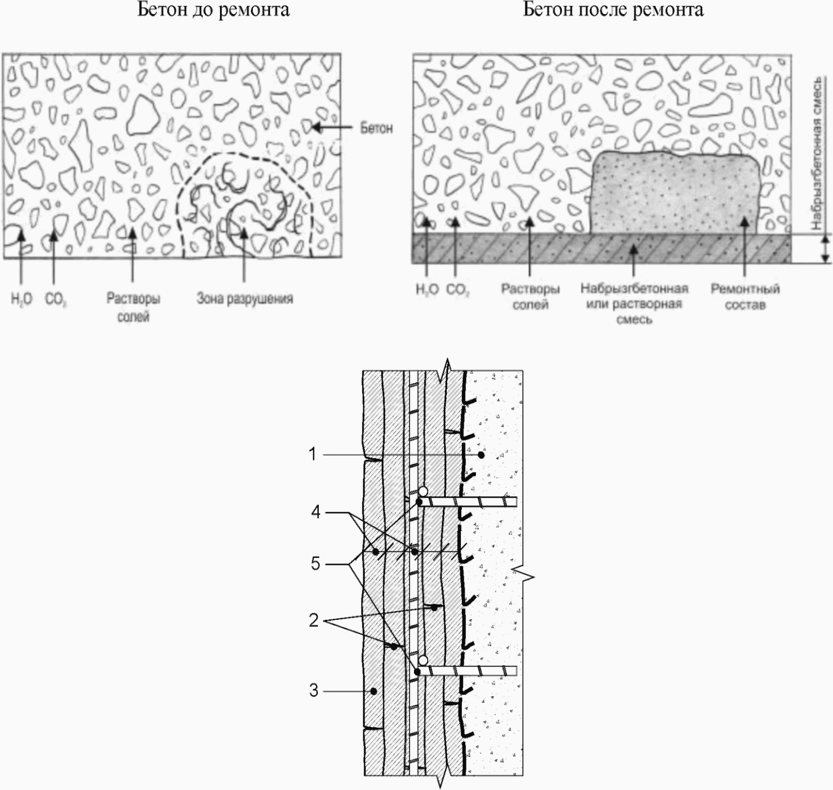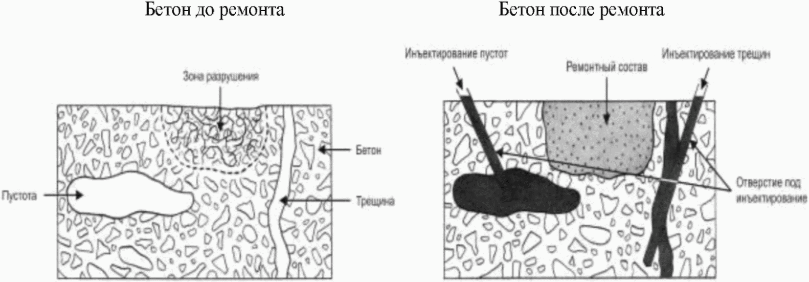 рисунке И.2. На участках с разрушенным бетоном выполняется его восстановление и уплотнение трещин.