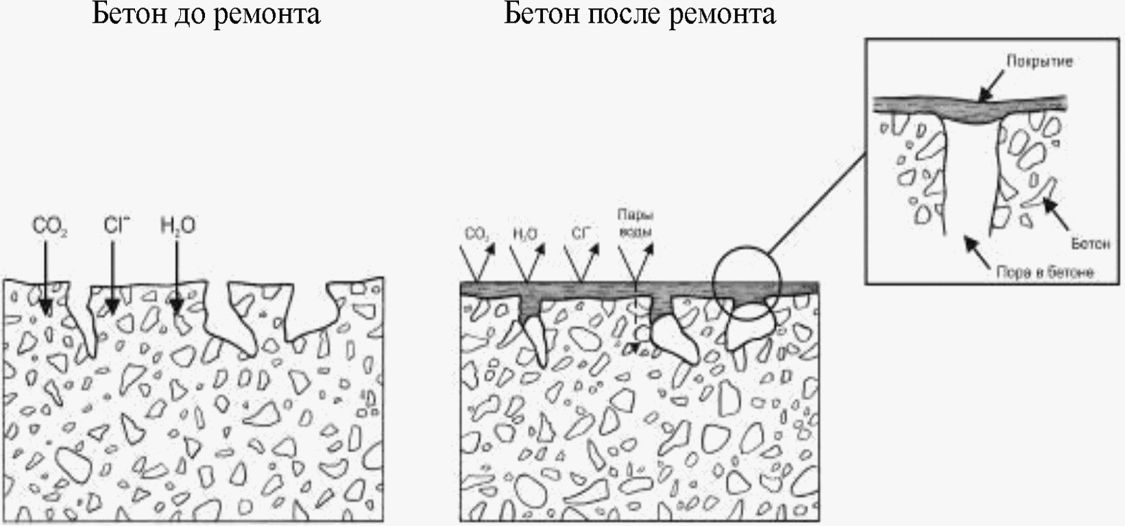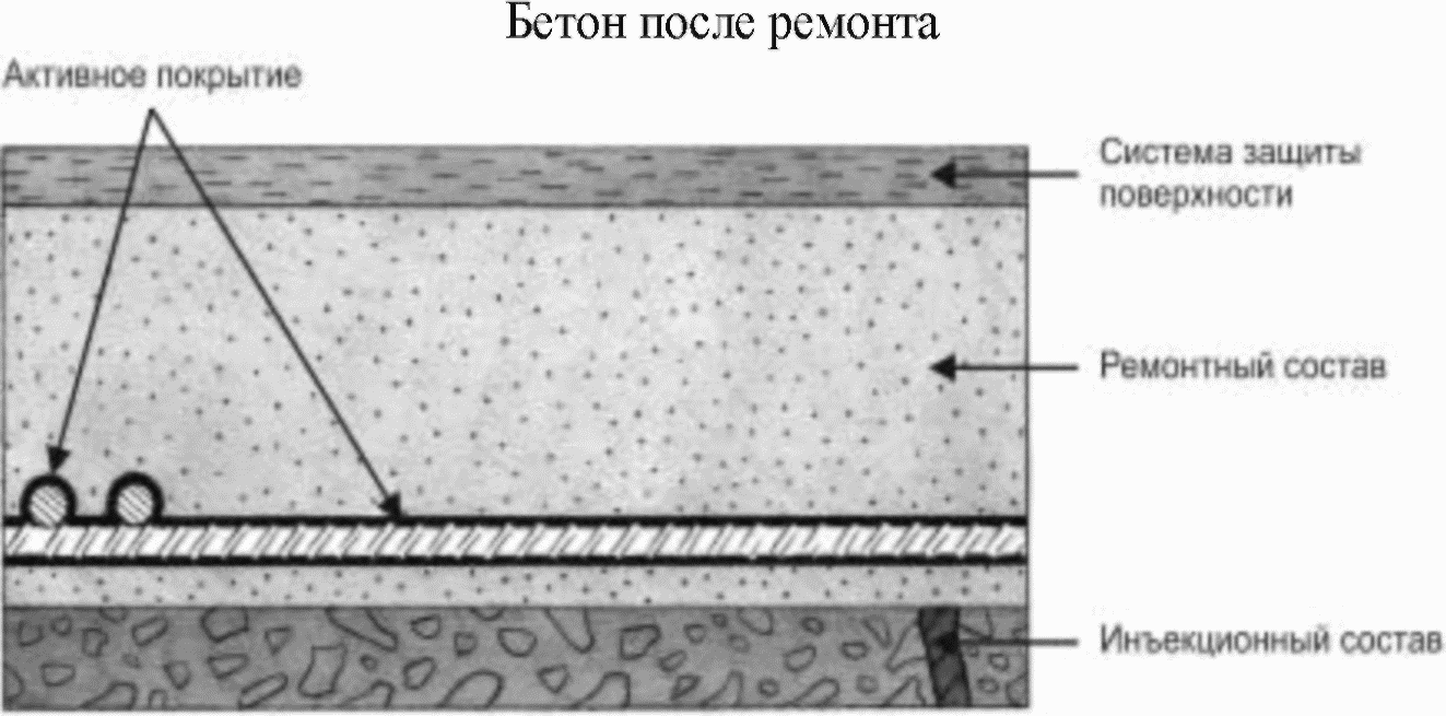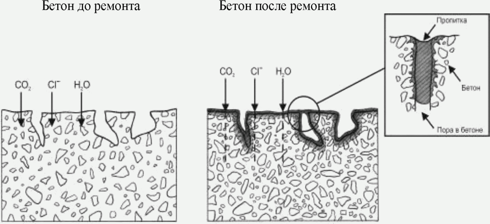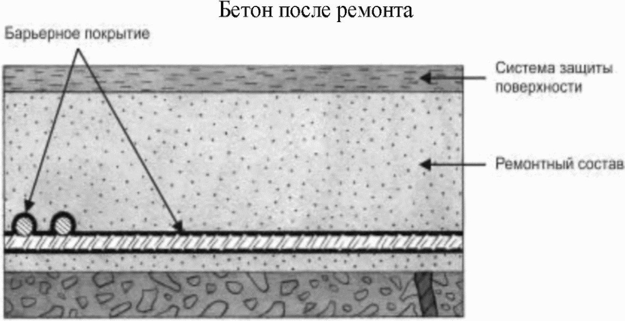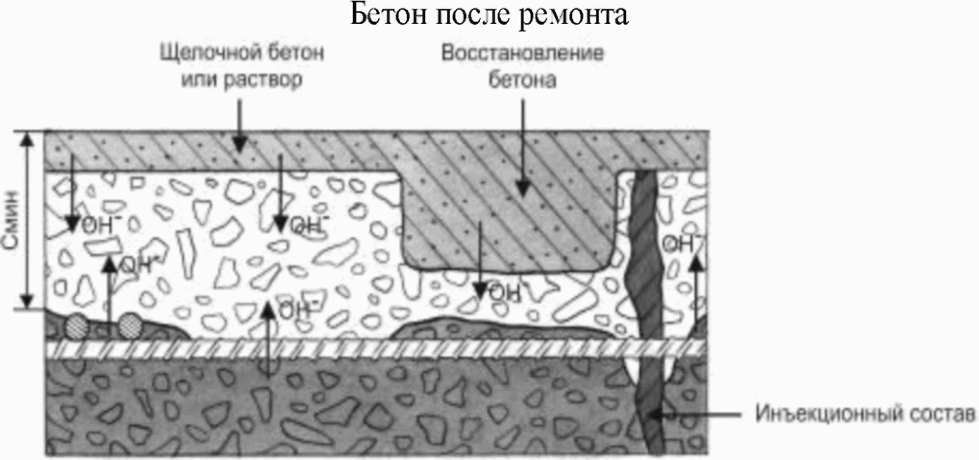 (метод 8.2) обеспечивает заполнение пор в поверхностном слое бетона для снижения содержания воды, повышение удельного сопротивления бетона и снижение скорости коррозии арматуры.