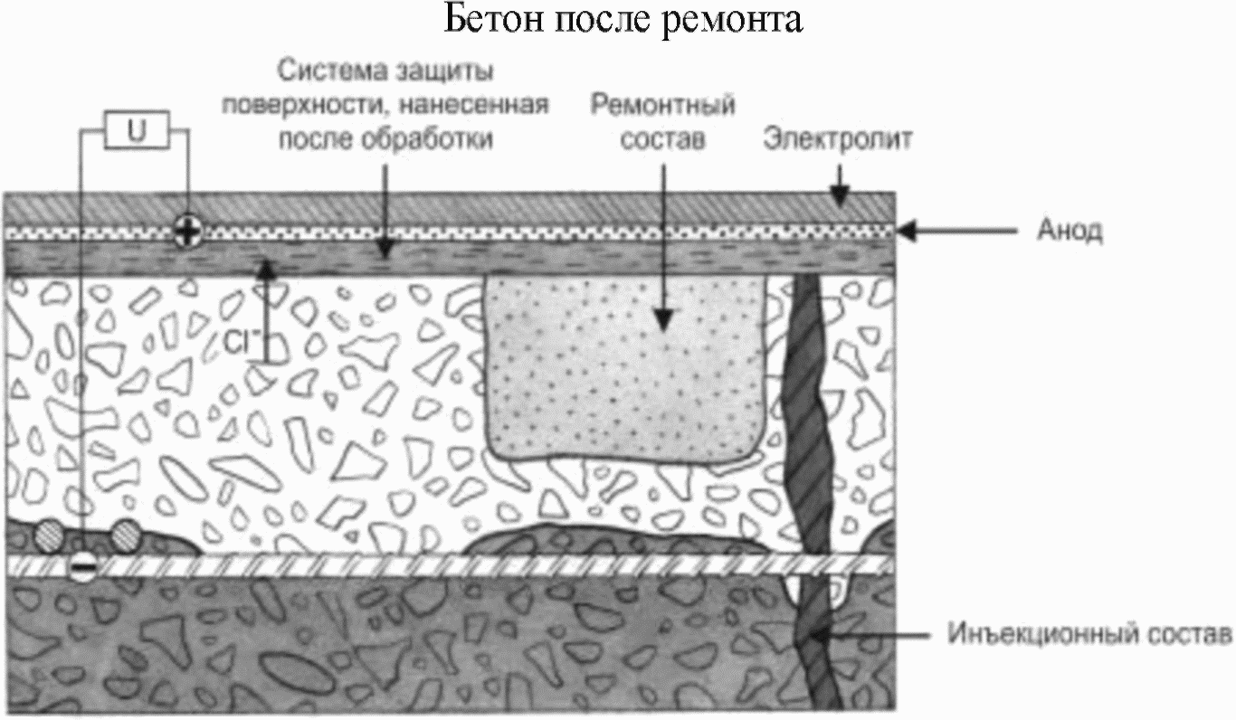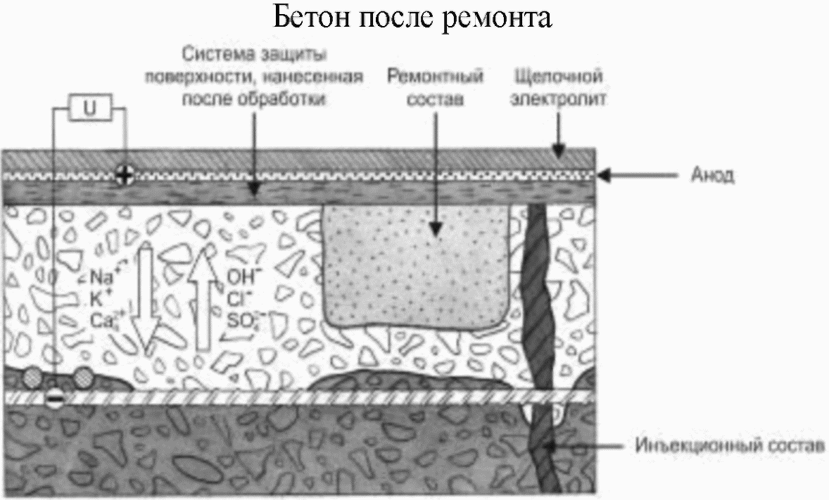 - замедление коррозии, обусловленной воздействием хлоридов (данный метод применим на раннем этапе при низком уровне содержания хлоридов).