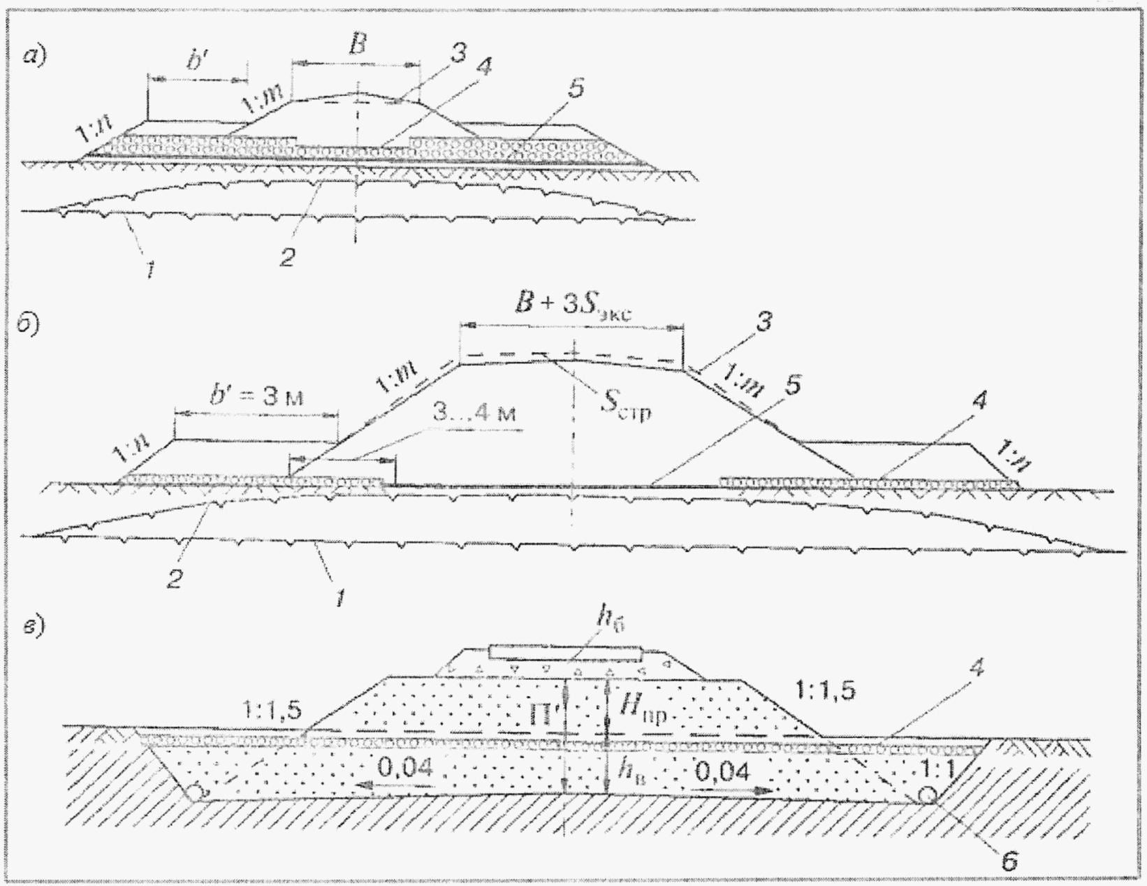 1 - слабый грунт; 2 - грунт тела насыпи; 3 - дорожное