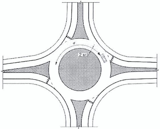 [9] для водителя, приближающегося к кольцевому пересечению, обеспечивают видимость автомобиля, приближающегося к нему с левой стороны для двух конфликтных направлений движения - по кольцевой проезжей части и по въезду на кольцевое пересечение. Видимость через центральный островок допускается не обеспечивать при выполнении указанного выше условия.